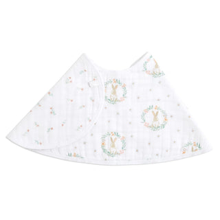 The aden + anais essentials cotton muslin burpy bib is a white triangular bib featuring a bunny inside a floral wreath and scattered floral designs, offering style and practicality with its absorbent fabric.