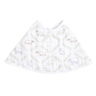 The aden + anais essentials cotton muslin burpy bib features white, semi-circular design with brown trees and pastel prints of rabbits, bears, and woodland creatures. Its absorbent with full coverage and a left-side button closure.