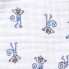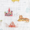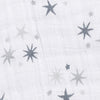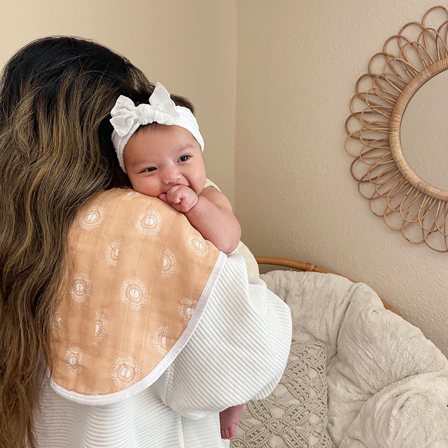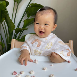 Aden + anais boutique 100% cotton muslin burpy bibs offer style and practicality, featuring one bib with rainbows on white and another with circles on light brown. Both provide full coverage with folded sections for convenience and charm.