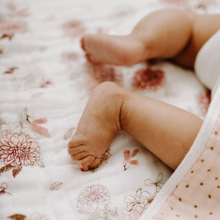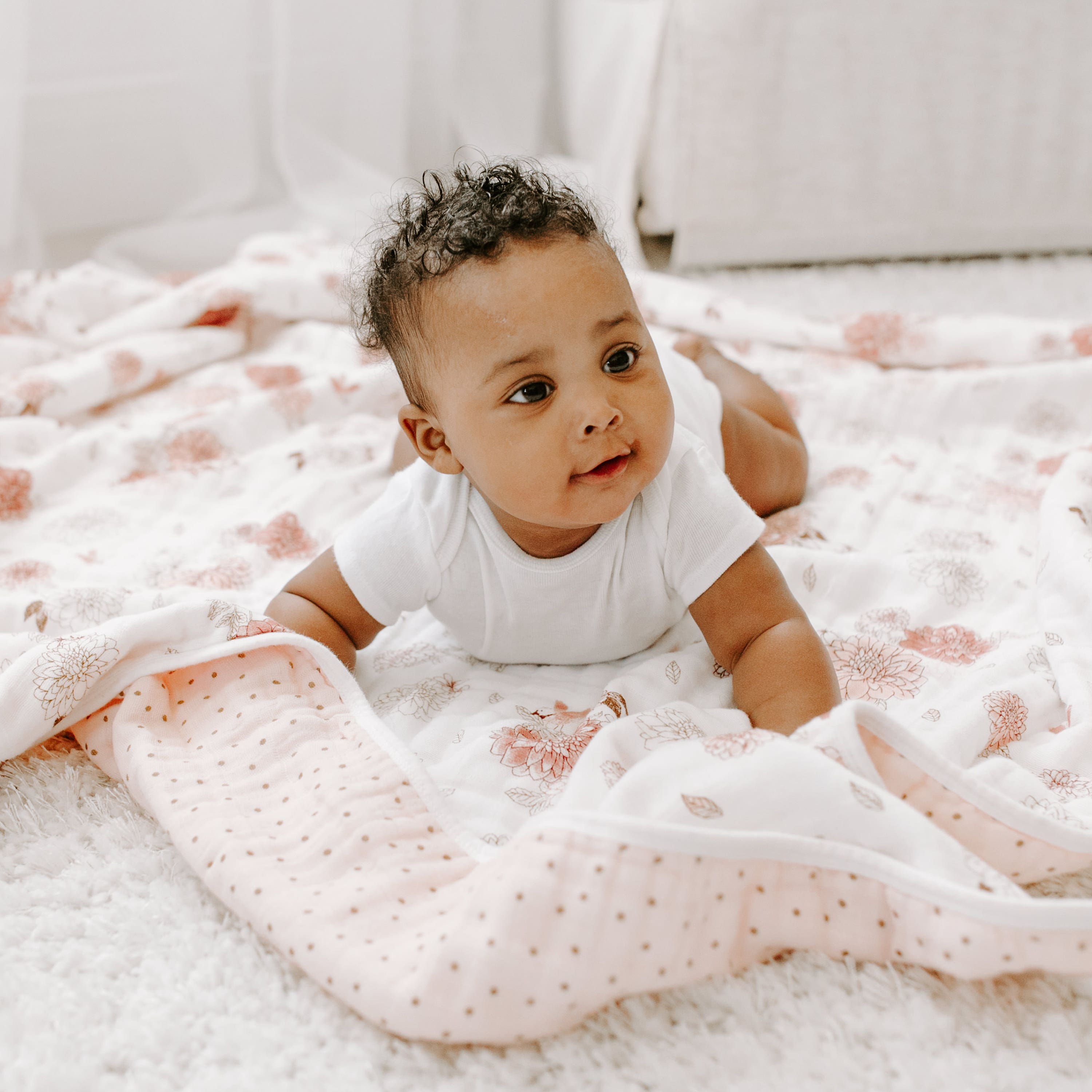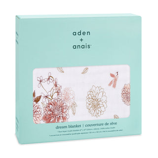The boutique cotton muslin dream blanket by aden + anais is crafted from 100% cotton muslin with a pattern of pink and white flowers and birds. It features a breathable texture and a corner design with pink polka dots, making it perfect for your little one.