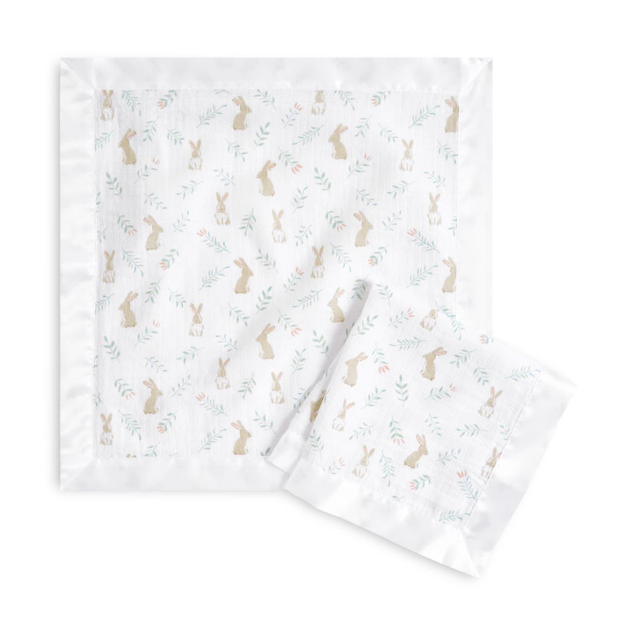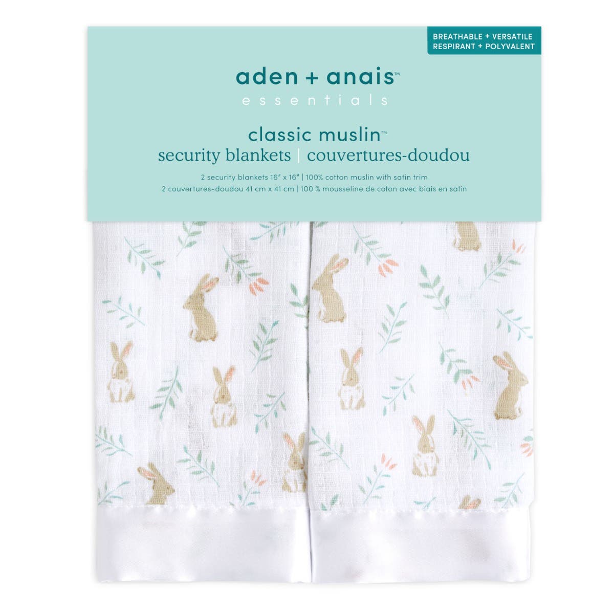 The aden + anais essentials cotton muslin security blankets, a 2-pack, feature charming brown bunnies with green and pink foliage. One blanket is unfolded and the other folded. Made from 100% cotton muslin with white satin borders, theyre perfect for newborns and toddlers.