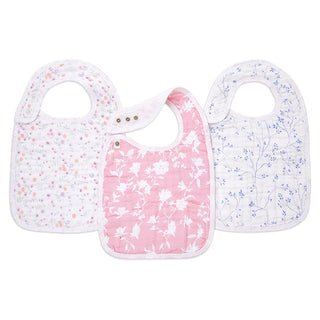 The aden + anais boutique 100% cotton muslin snap bibs 3 pack features adjustable, absorbent comfort with floral designs: pastel flowers on the left, pink with white blooms in the middle, and white/blue florals on the right. Each bib ensures easy neck closure.