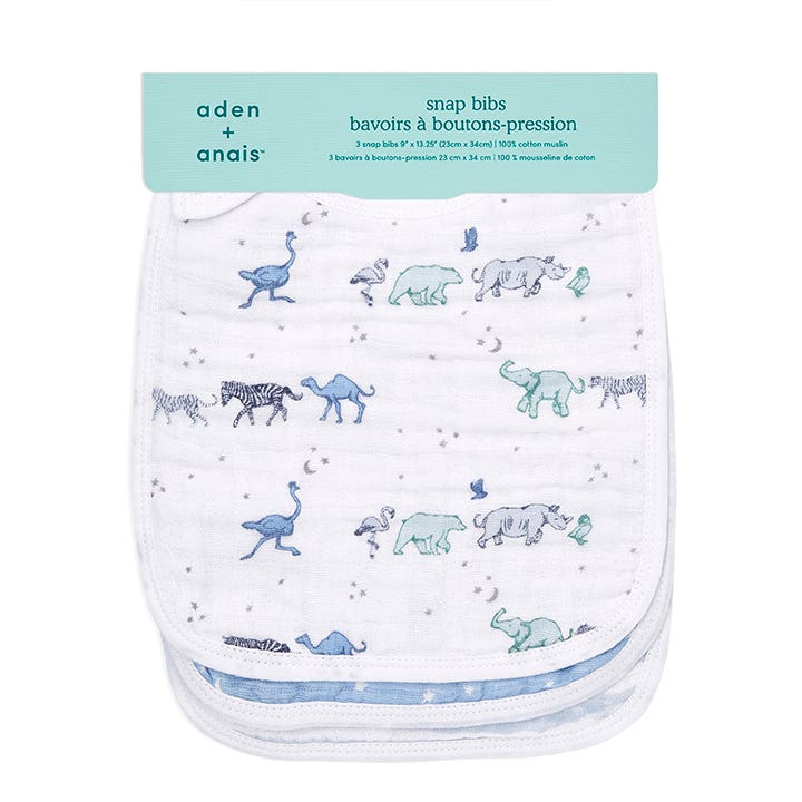 Aden + anais boutique 100% cotton muslin snap bibs come in a 3-pack featuring designs with white stars on blue, pastel animal and people patterns on white, and blue and white stripes. Each bib is absorbent and adjustable for a comfortable fit.