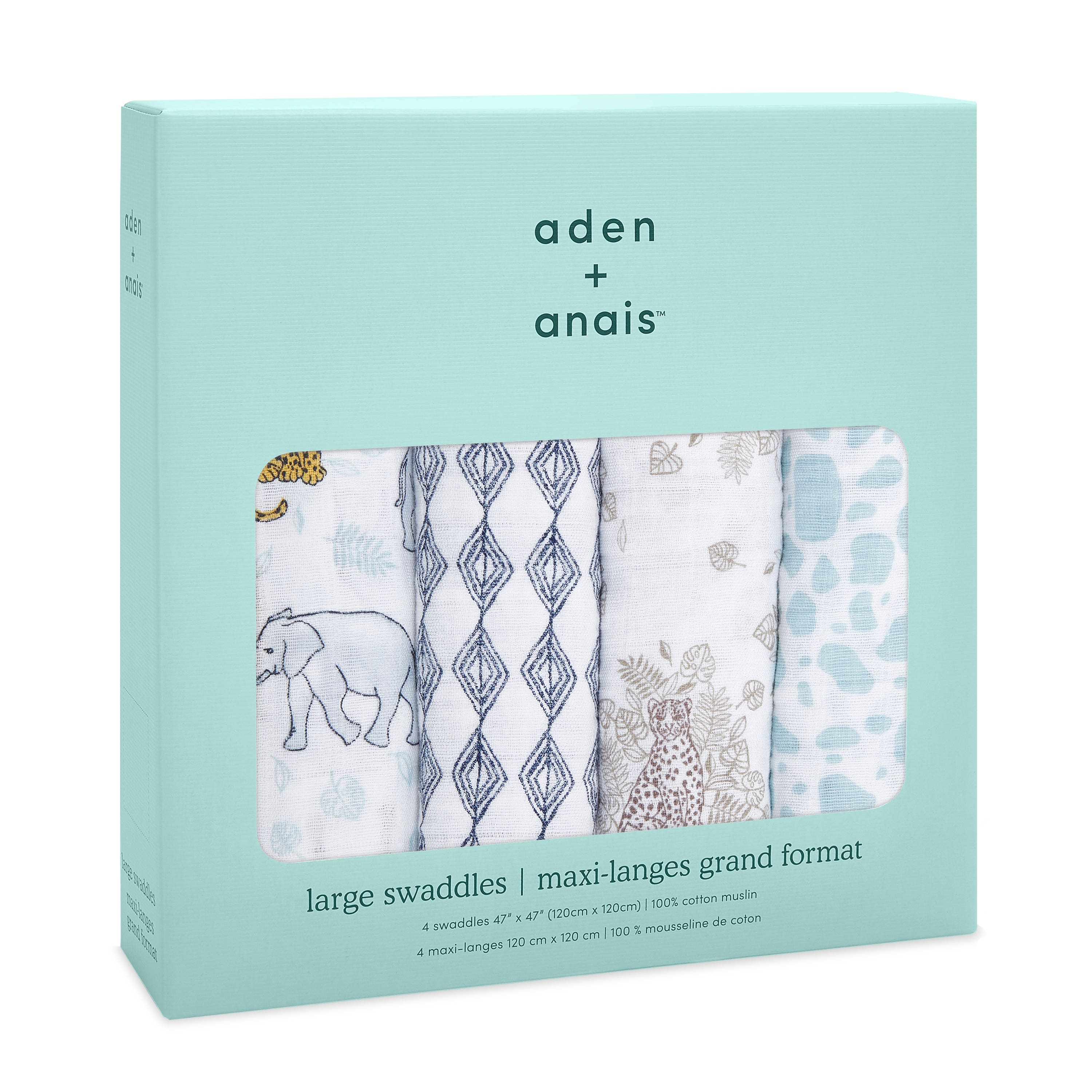 Four rolled-up boutique 100% cotton muslin swaddle blankets from aden + anais are displayed vertically, featuring giraffes, elephants, leopards, geometric shapes, and soft blue prints. These swaddles are absorbent, breathable, and colored in white, blue, brown, and black.