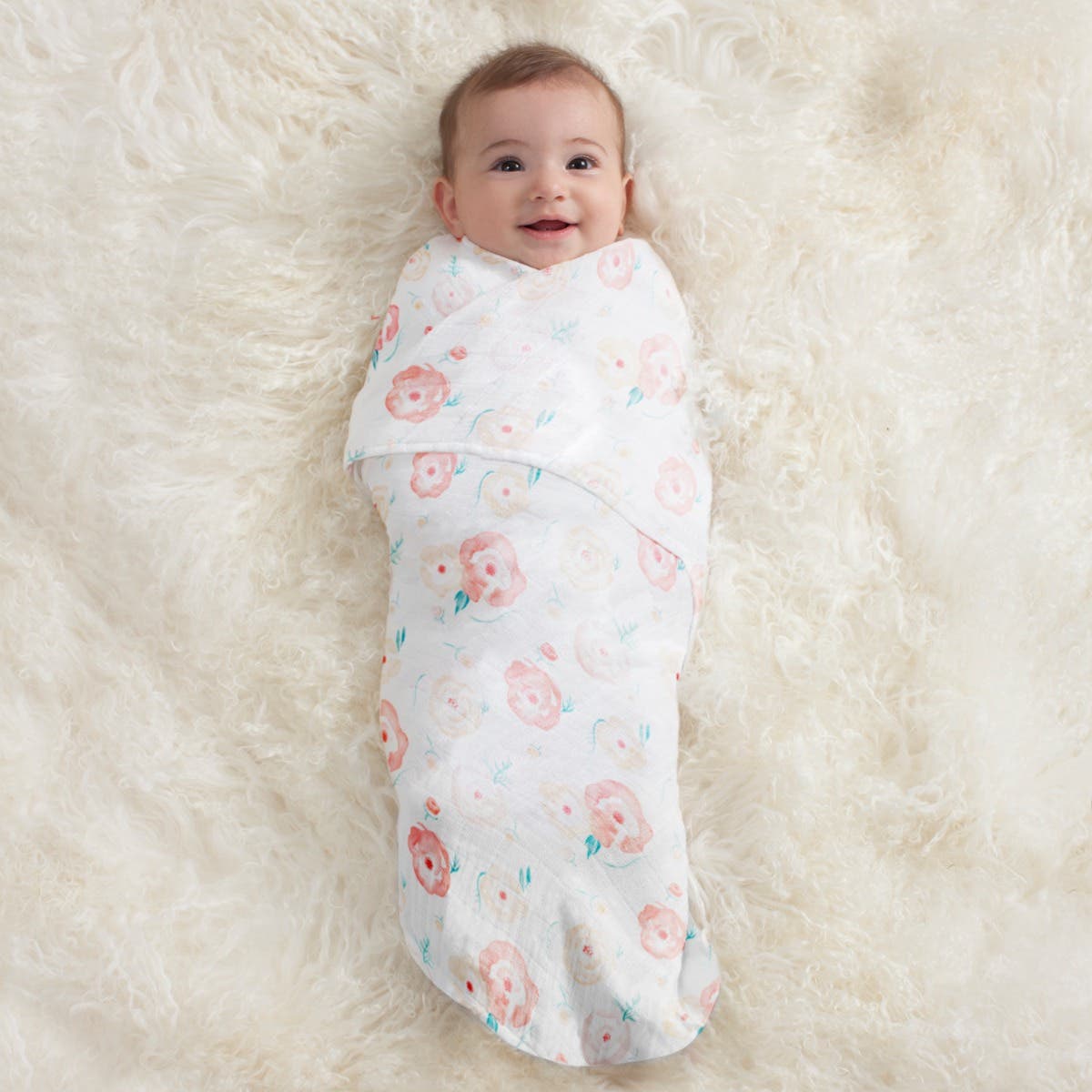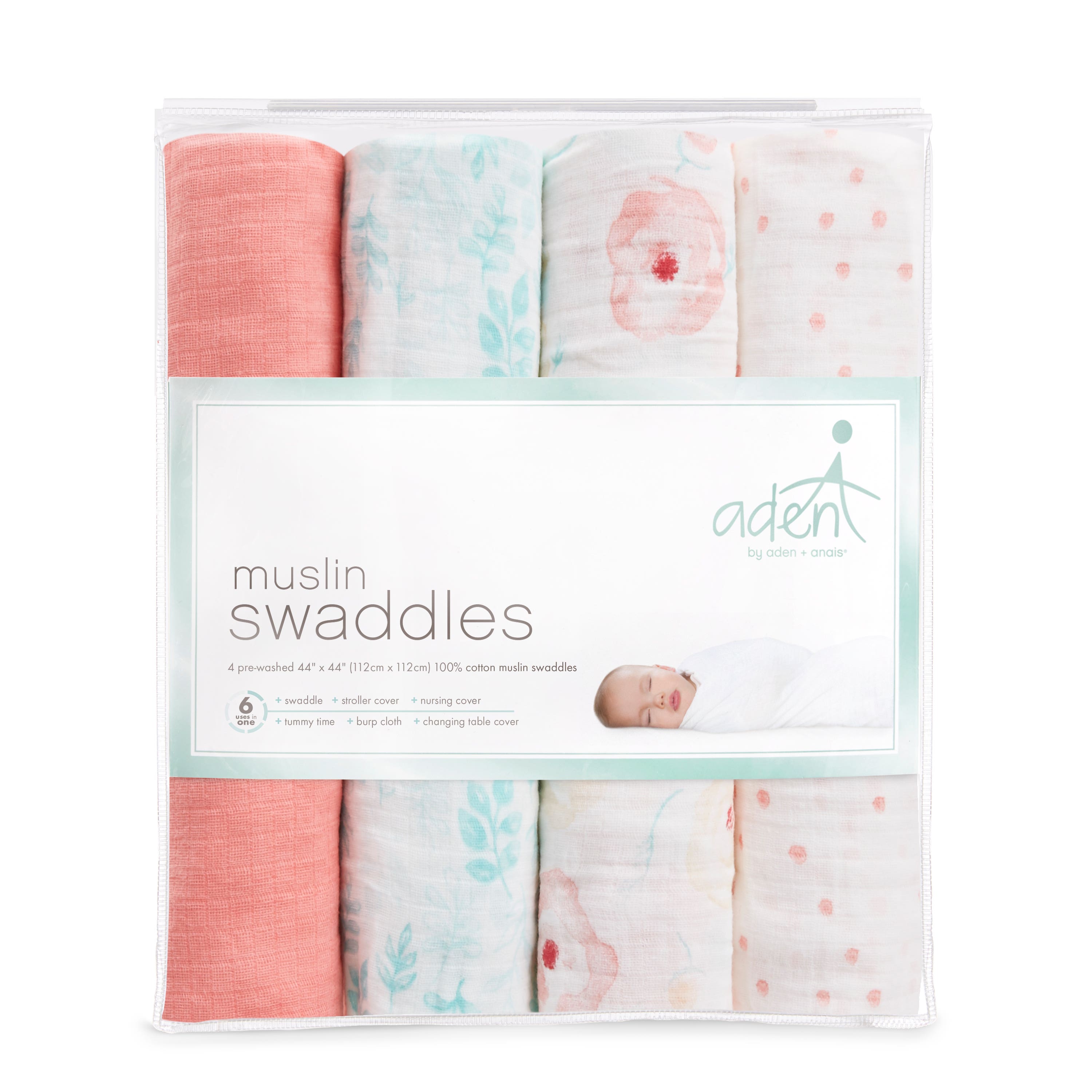 Four rolled aden + anais essentials cotton muslin swaddle blankets are side by side. The designs feature solid pink, floral, leafy patterns, and pink polka dots on white backgrounds, making them perfect for your babys peaceful rest.