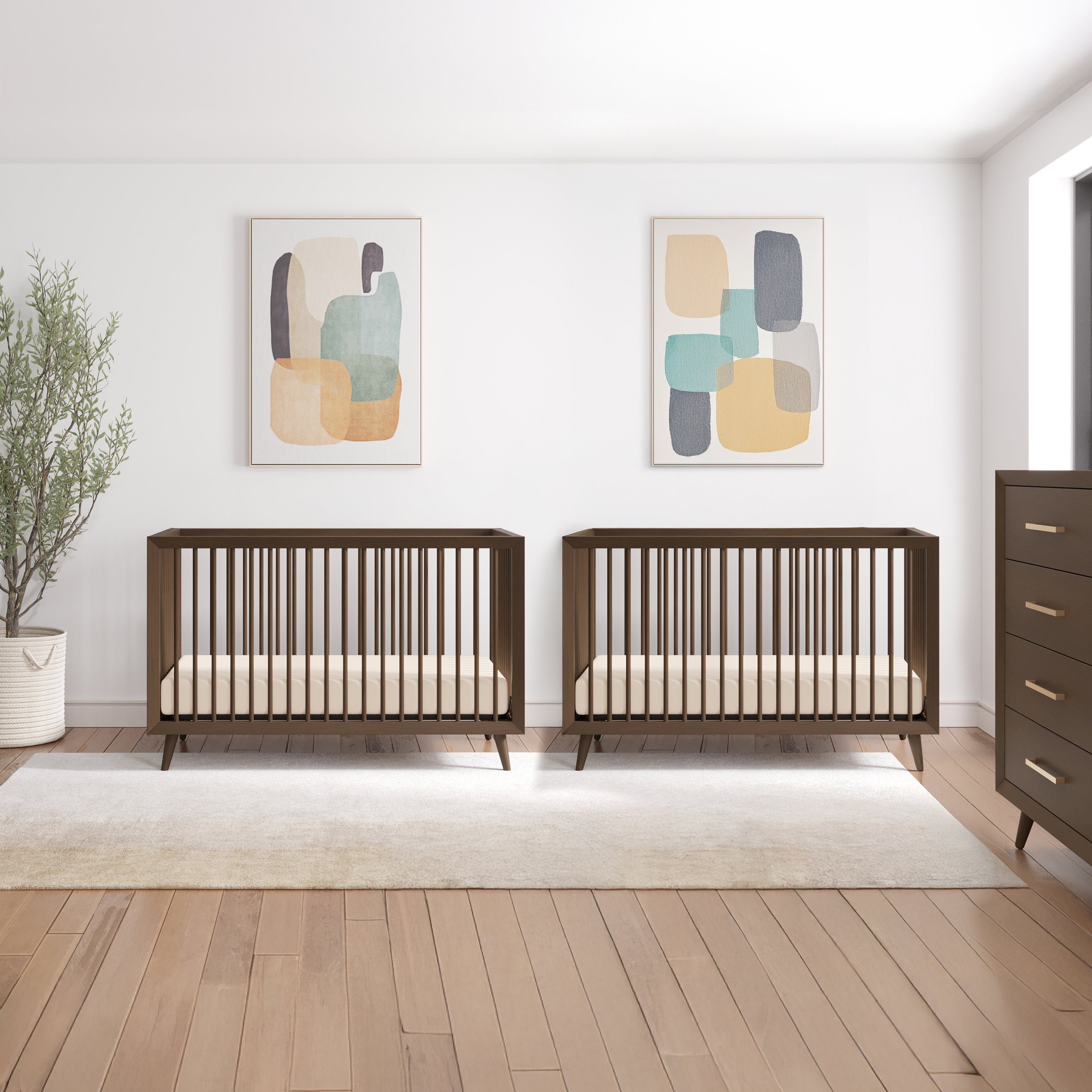A modern nursery with the Child Craft Cranbrook 4-in-1 Convertible Crib in Ebony, matching dressers, round mirror, potted plant, wall art, and a large beige rug on wood floors. Neutral tones and minimal furniture create a calm, stylish space.