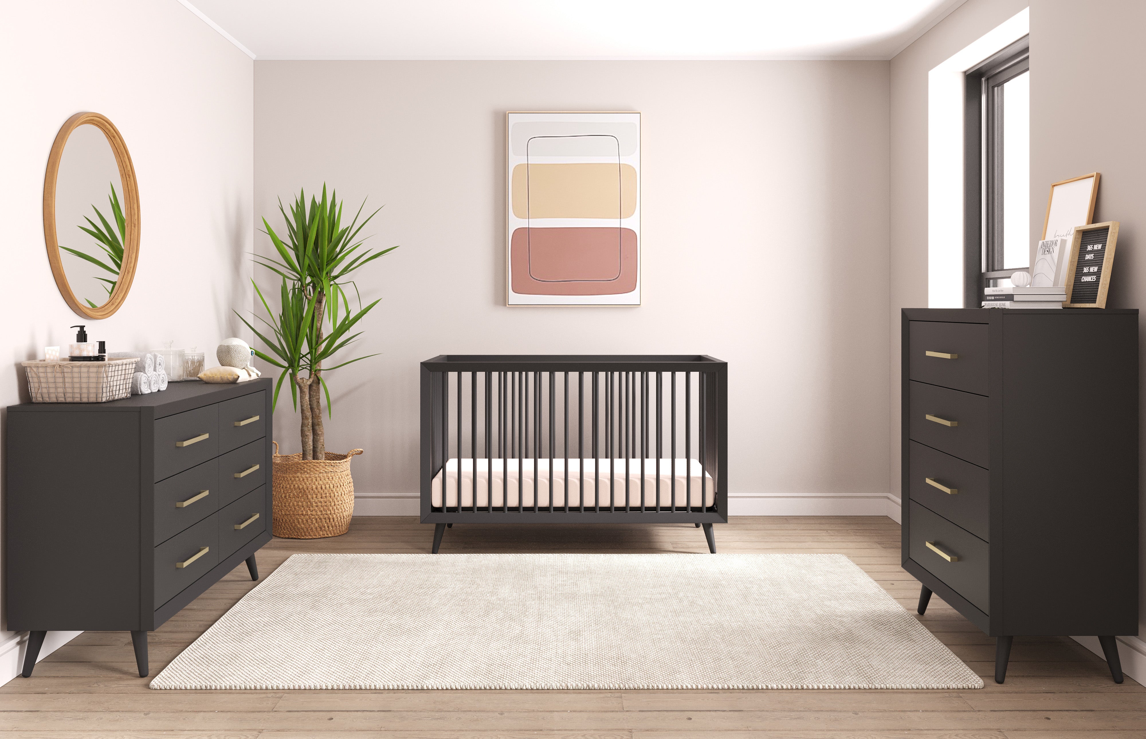 A modern nursery with the Child Craft Cranbrook 4-in-1 Convertible Crib in Ebony, matching dressers, round mirror, potted plant, wall art, and a large beige rug on wood floors. Neutral tones and minimal furniture create a calm, stylish space.