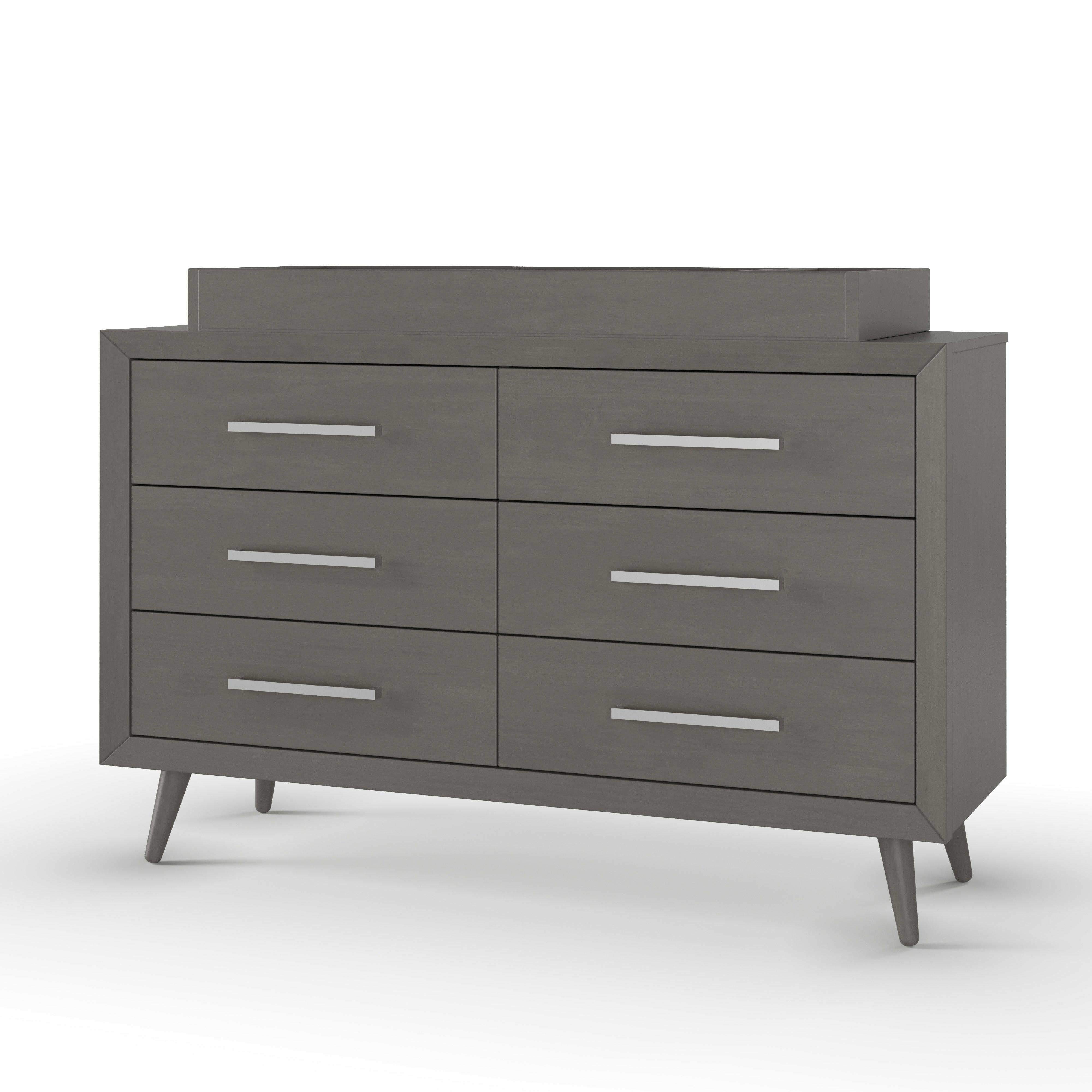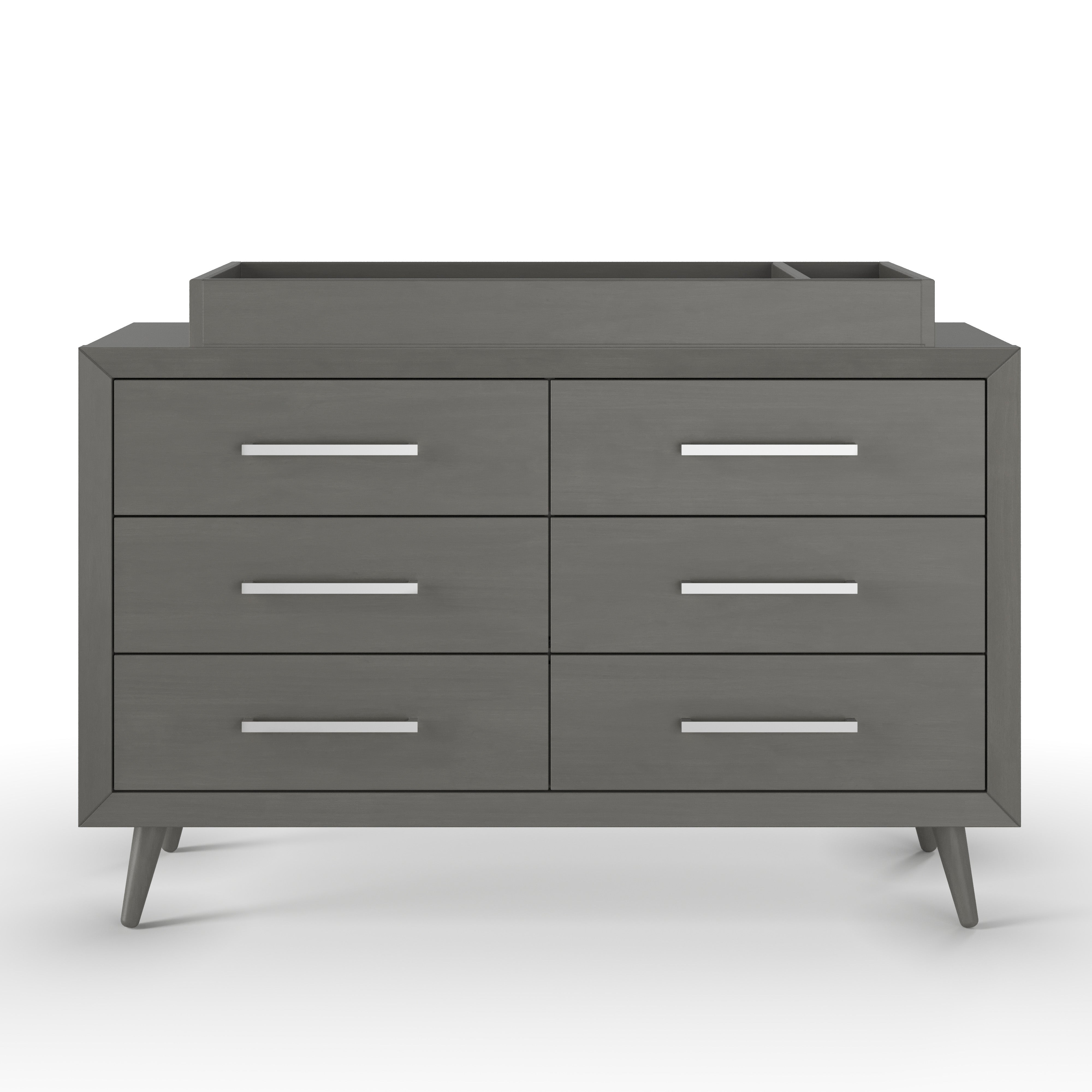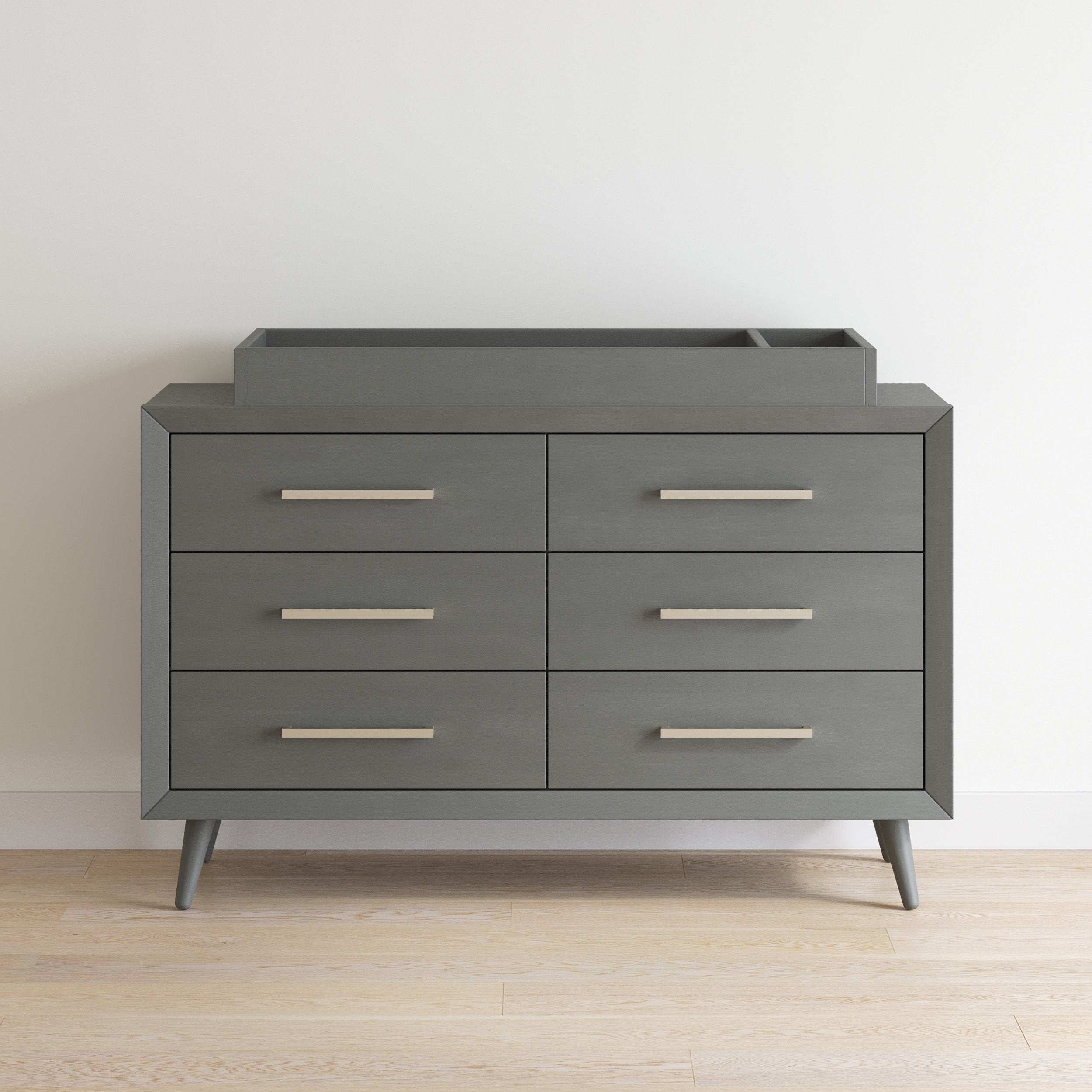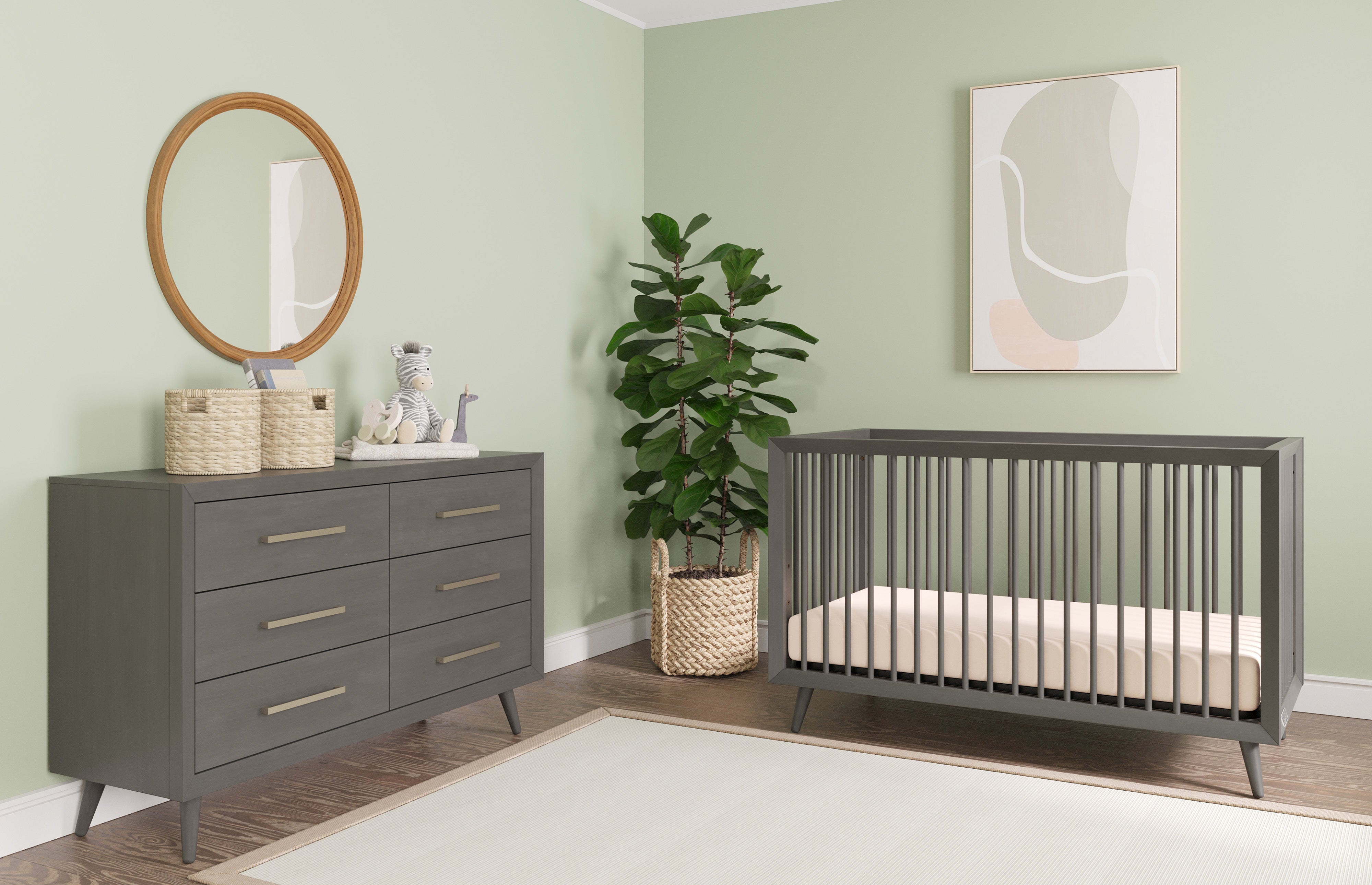 A Child Craft Cranbrook Double Dresser in Lunar Gray with six drawers sits against a light green wall. Two woven baskets and folded baby clothes rest on top, with a round wooden-framed mirror above and a white teddy bear on the floor nearby.