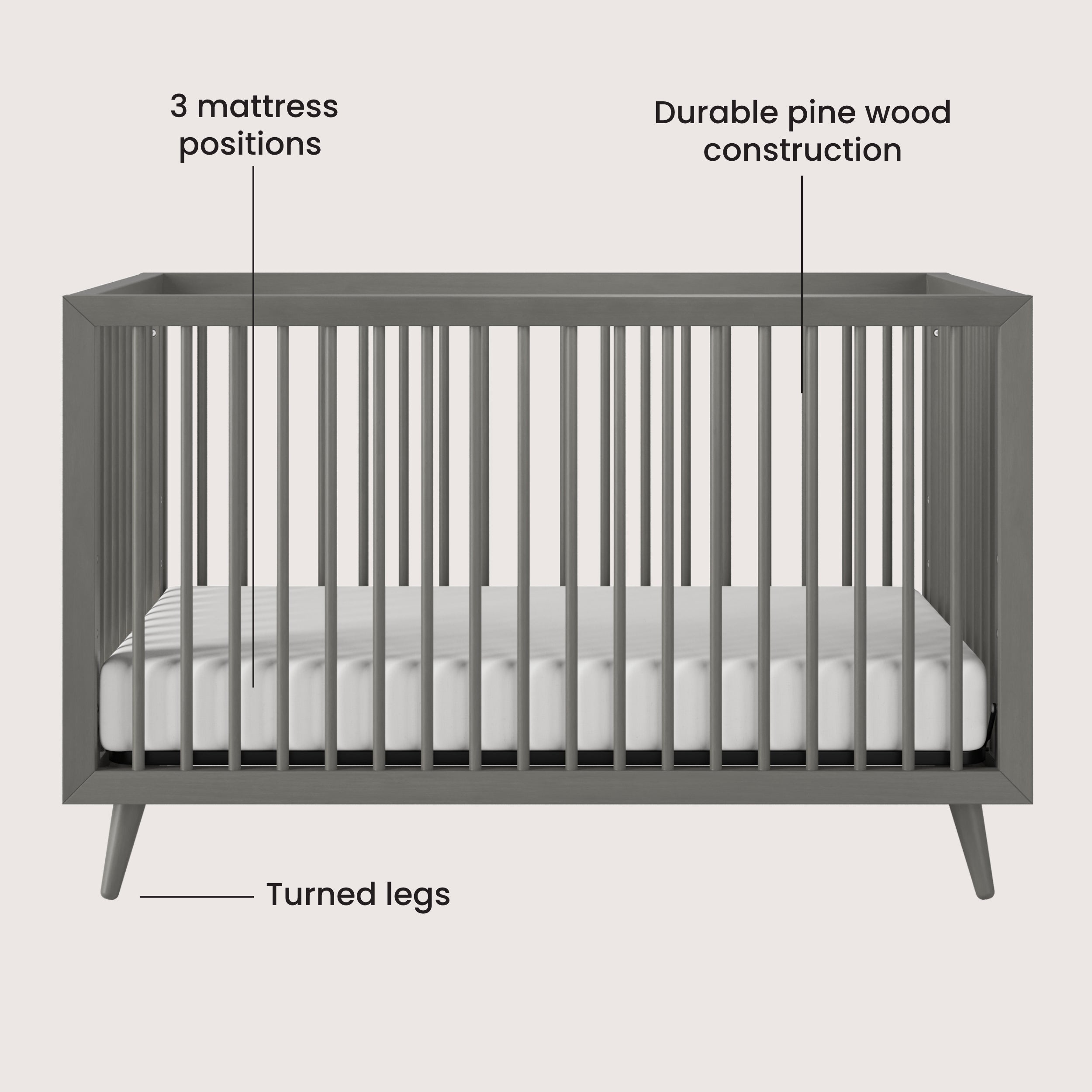 Bring a Mid Century Modern feel to your baby’s nursery with the Cranbrook 4-in-1 Convertible Crib. This contemporary nursery crib features mitered corners. The turned legs and rounded spindles add to the modern simplicity. 3 sophisticated finishes highlight the crib's unique features. Pair with coordinating pieces from the Child Craft Cranbrook nursery furniture collection to complete your child’s bedroom. 4-in-1 convertible crib grows with your child by converting into a toddler bed, day bed, and a full bed with a coordinating toddler guard rail (F09502) and bed rails (F06402, Hollywood Frame), sold separately Crafted of strong, sturdy pine wood and veneers to create a gorgeous mid century modern feel Strong metal mattress support adjusts to 3 heights to accommodate your growing infant Fits most standard size crib mattresses (sold separately) Assembled Dimensions: 55.24”L x 30.57”W x 35.19”H Non-toxic baby-safe finish Meets ASTM and CPSC standards Easy assembly