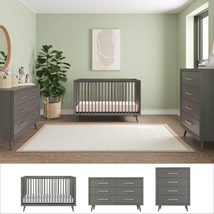 The Cranbrook baby nursery furniture collection brings a contemporary Mid Century Modern feel to your baby's room with it's mitered corners and turned legs. This 3 piece nursery furniture set includes the Cranbrook 4-in-1 convertible crib, coordinating double dresser, and 4 drawer chest. The Cranbrook 3 pc. nursery set is available in 3 modern finishes and coordinates with other pieces from the Cranbrook furniture collection to complete the space.