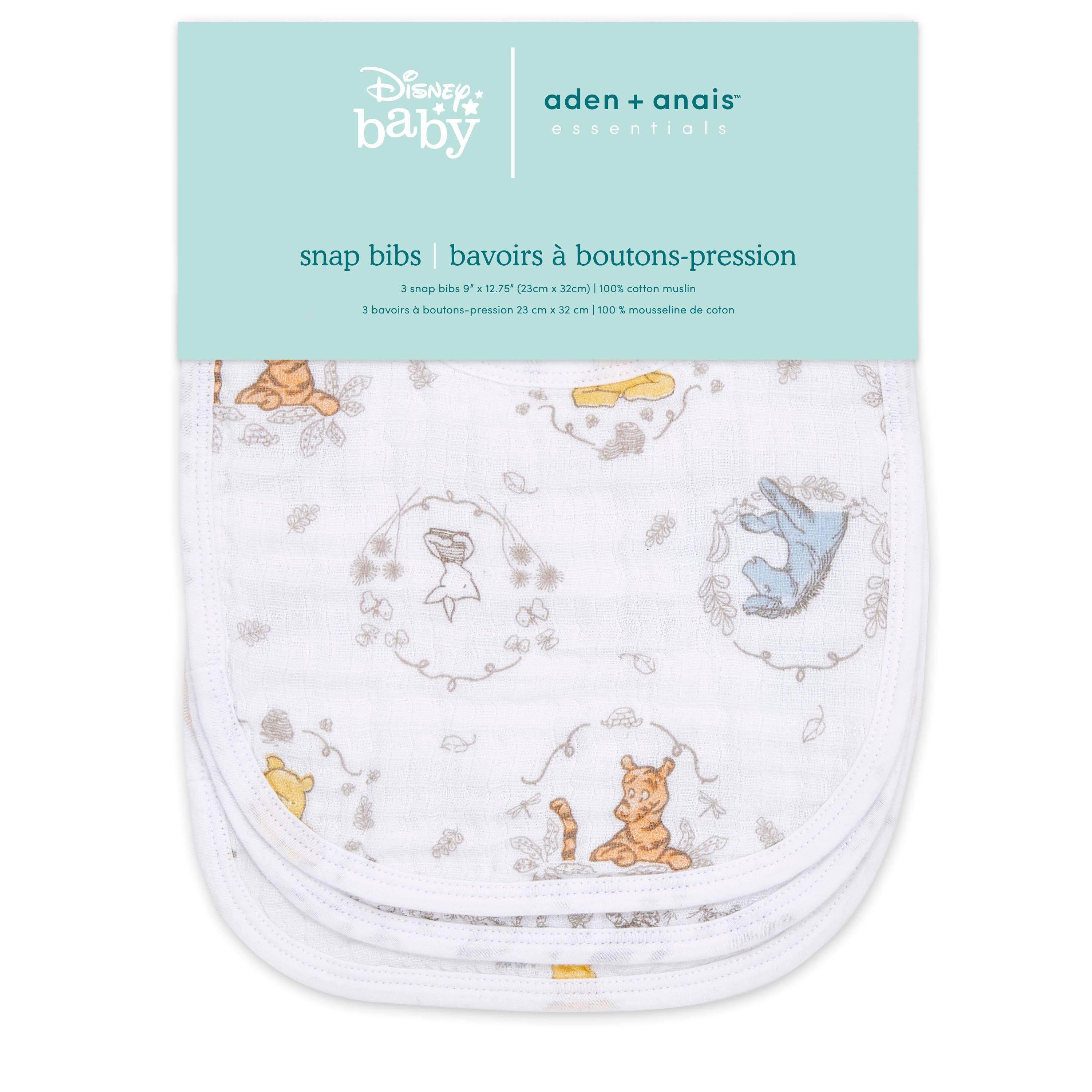 The aden + anais Disney™ essentials cotton muslin snap bibs 3 pack features absorbent bibs with designs of gray elephants, assorted animals, and yellow ducks. Perfectly crafted to grow with your baby.