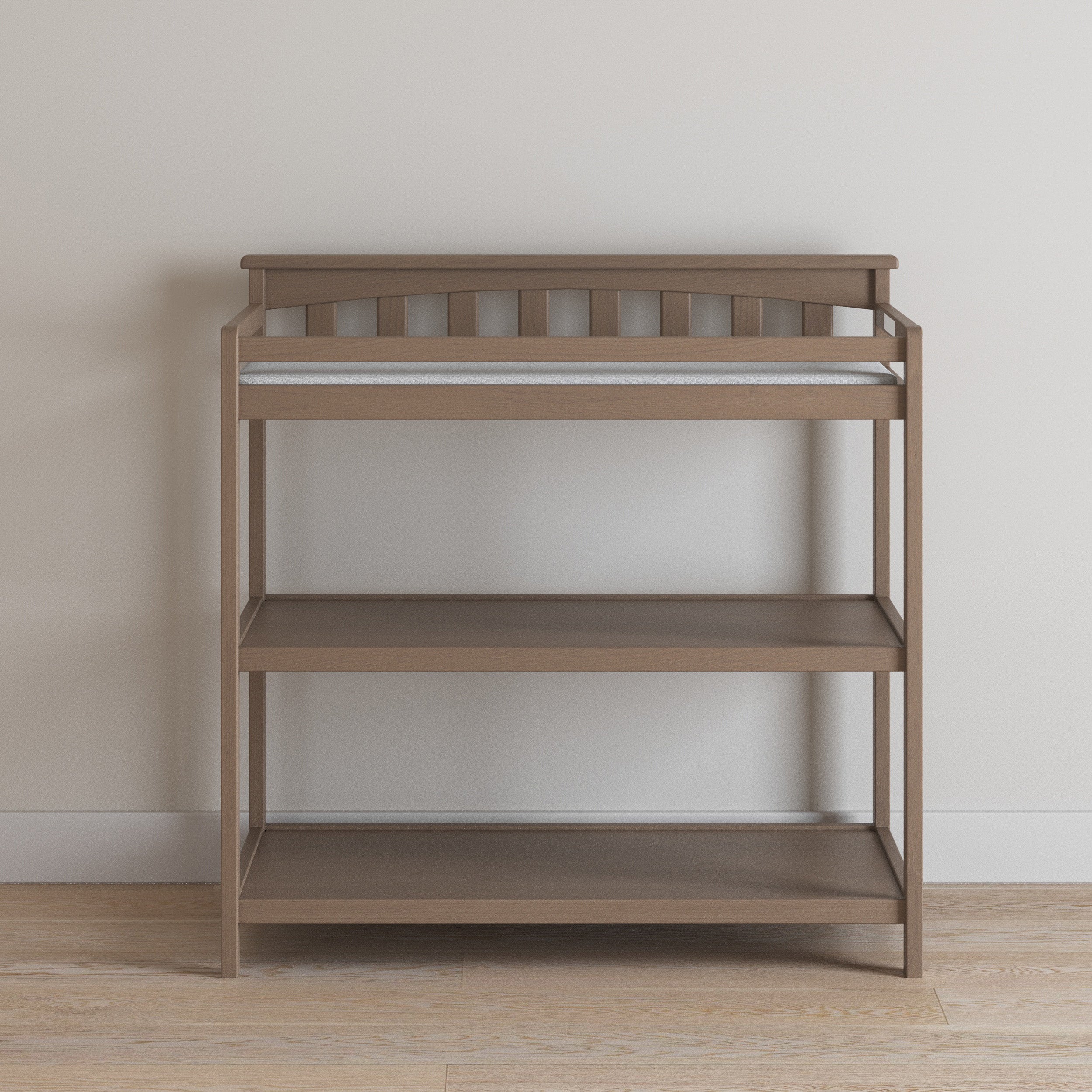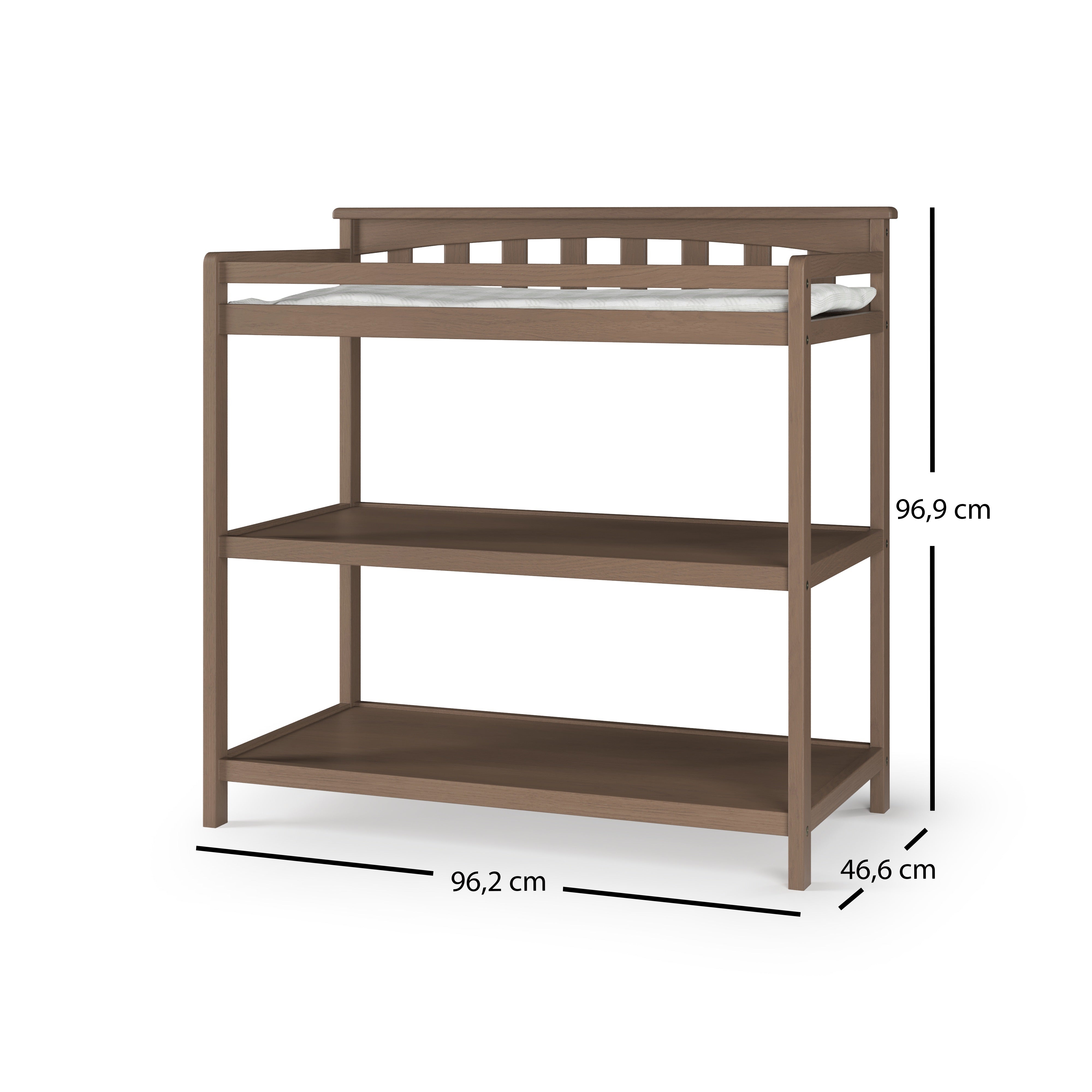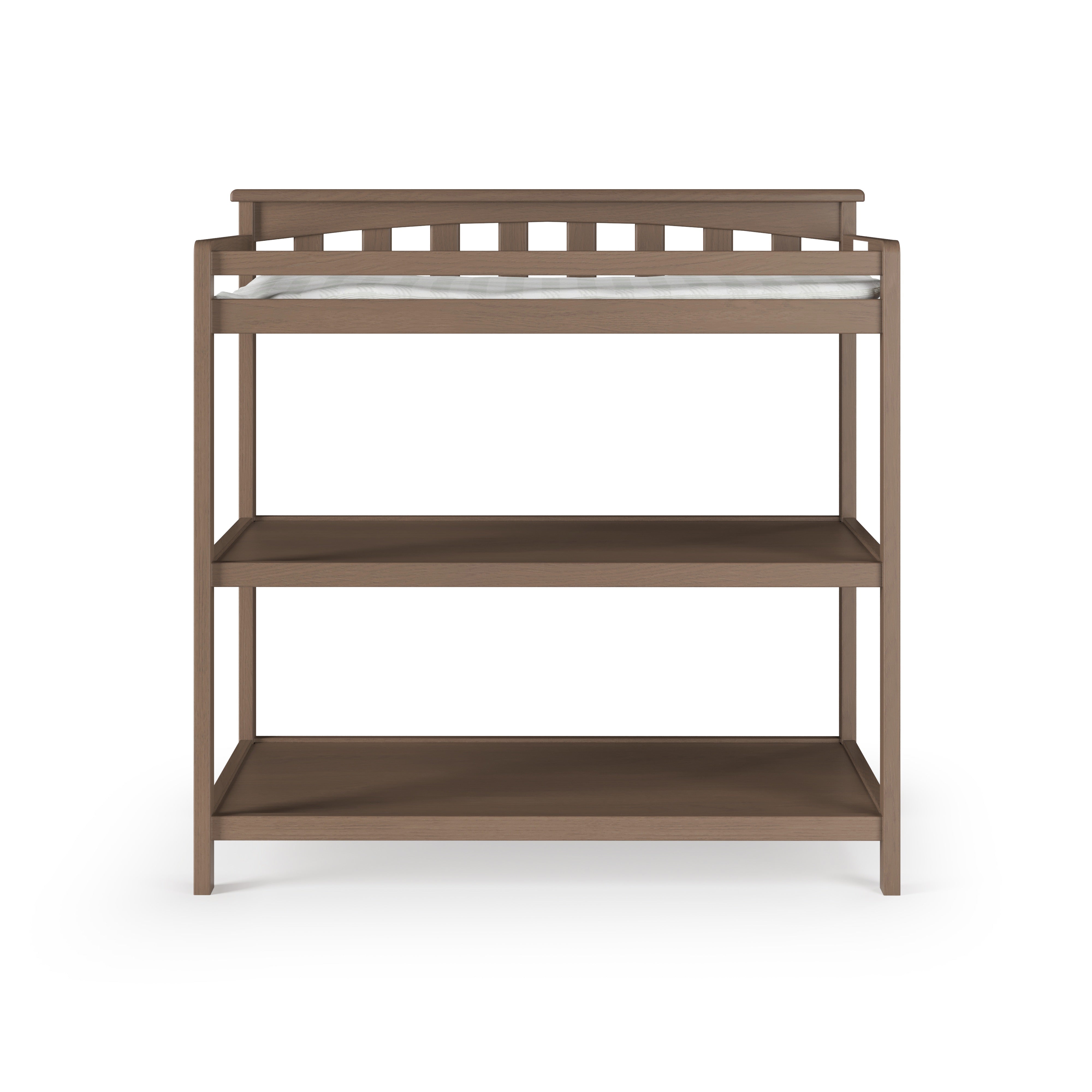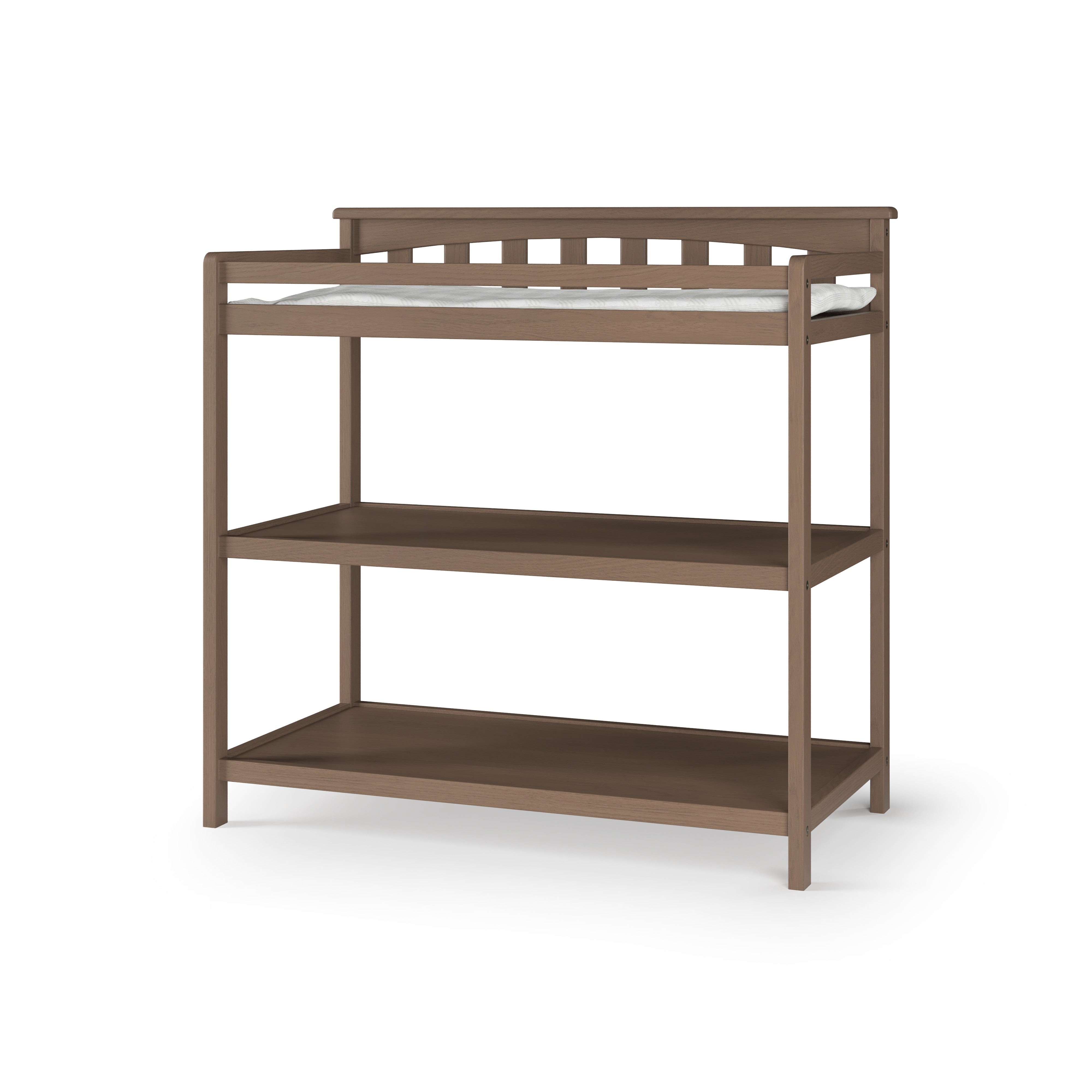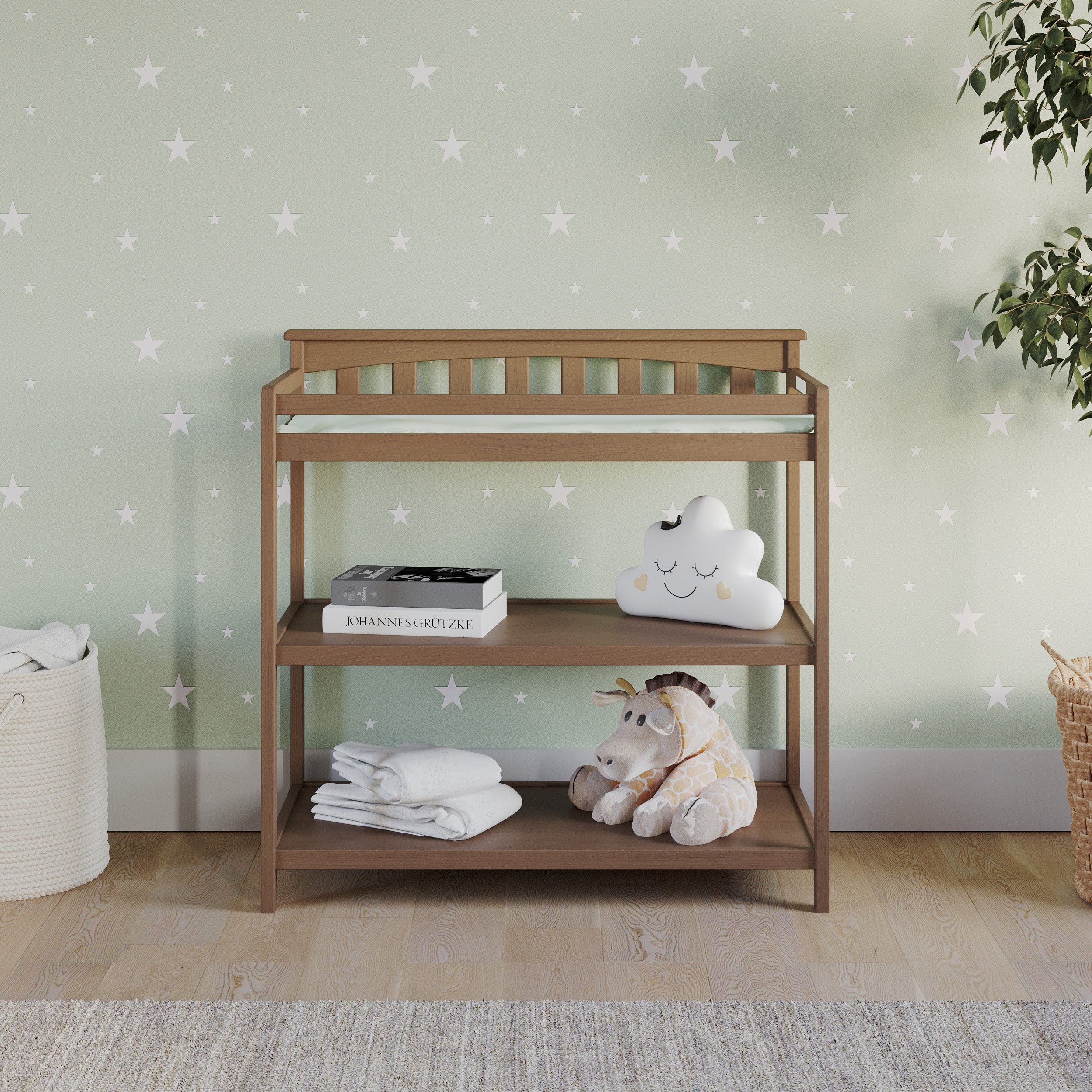 The Child Craft Flat Top Baby Changing Table in Dusty Heather features two shelves for storage, holding a box, cloud pillow, white towels, and plush unicorn. A mint green wall with white stars and a plant on the right add to the cozy nursery feel.