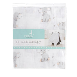 The aden + anais essentials cotton muslin car seat canopy is a white, breathable cover with a subtle animal print, made from soft cotton muslin and designed to drape over baby car seats for comfort and style.