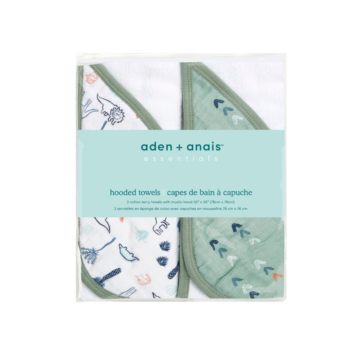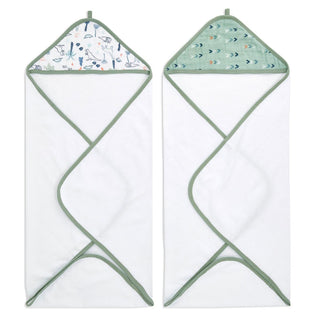 The aden + anais essentials cotton muslin hooded towels 2-pack features two white towels with green trim, crafted from plush cotton terry. One has a wildlife pattern on the hood, the other has stylized arrows, both super absorbent with hanging loops for convenience.