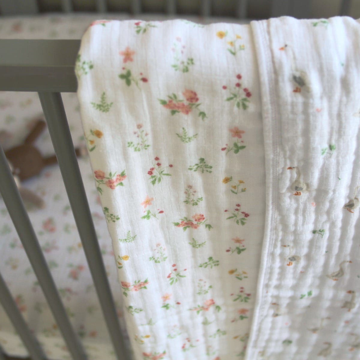 The aden + anais essentials cotton muslin dream blanket, in white, unfolds a warm and cozy ambience with a delightful floral and animal print of delicate pink flowers on textured cotton muslin.