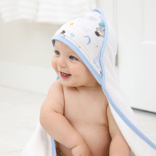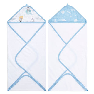 Displayed are two aden + anais essentials cotton muslin hooded towels. One features an outer space theme with planets and stars, while the other showcases a baby animal design with bears and balloons. Both white fabric towels are absorbent and gentle for your little one.