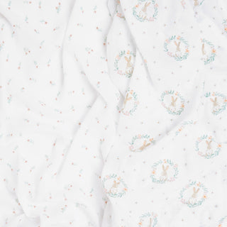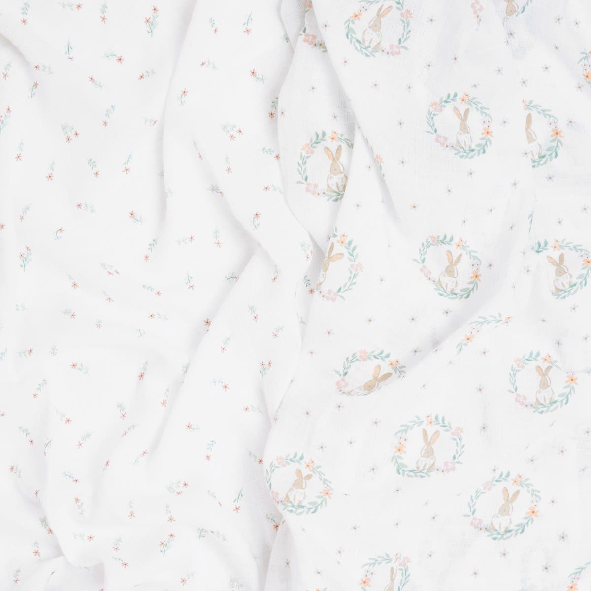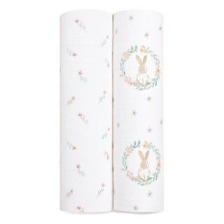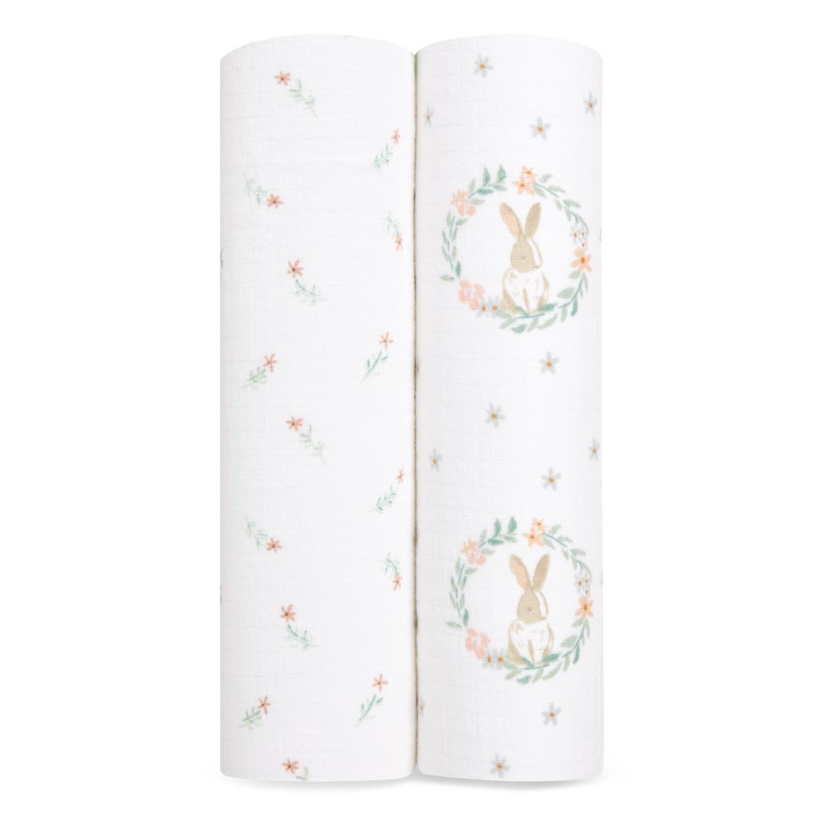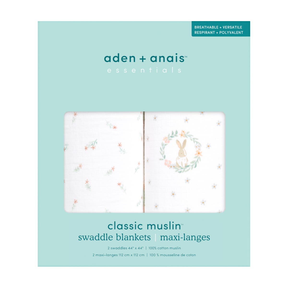 The aden + anais essentials cotton muslin swaddle blanket 2-pack includes two rolled blankets: one with colorful flowers on a white background, and another featuring a rabbit in a floral wreath. Made from soft cotton muslin, they are lightweight and breathable.