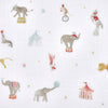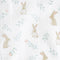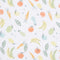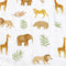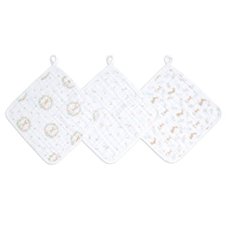 The aden + anais essential cotton muslin washcloths 3 pack includes three cloths with pastel floral wreaths, small dots, and animal patterns. Ideal for delicate skin, each cloth has a loop for hanging and is displayed in a row on a flat surface.