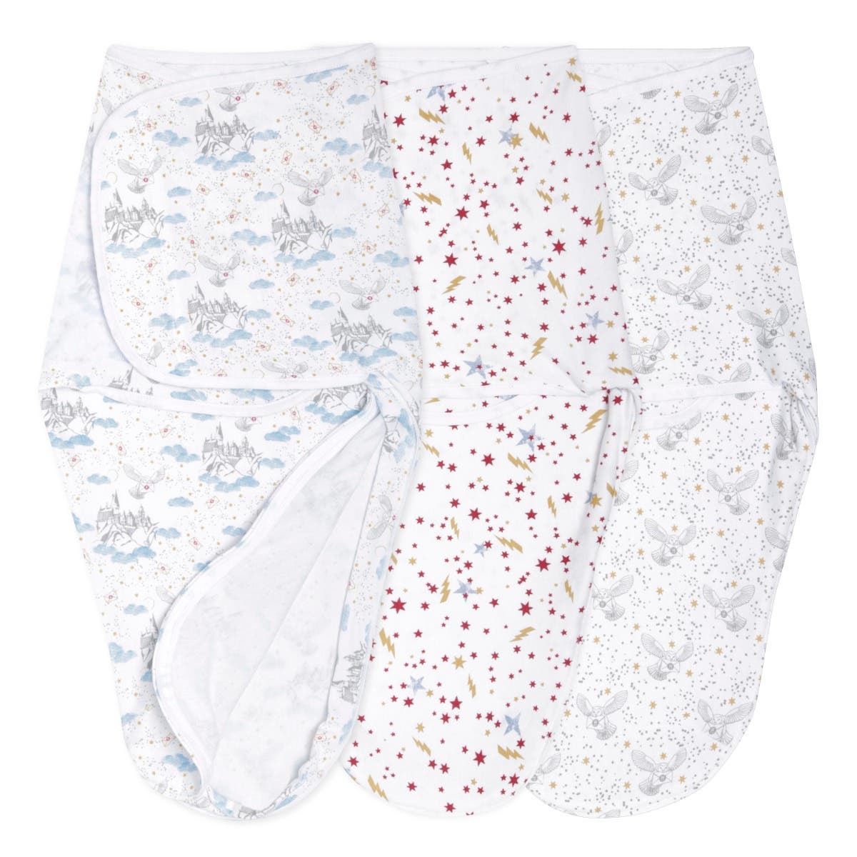 The aden + anais essentials easy swaddle wrap quick change 3 pack TOG 1.0 features whimsical designs like unicorns, castles, stars, and elephants. These soft blankets come with adjustable fasteners for swift changes, offering both comfort and convenience.