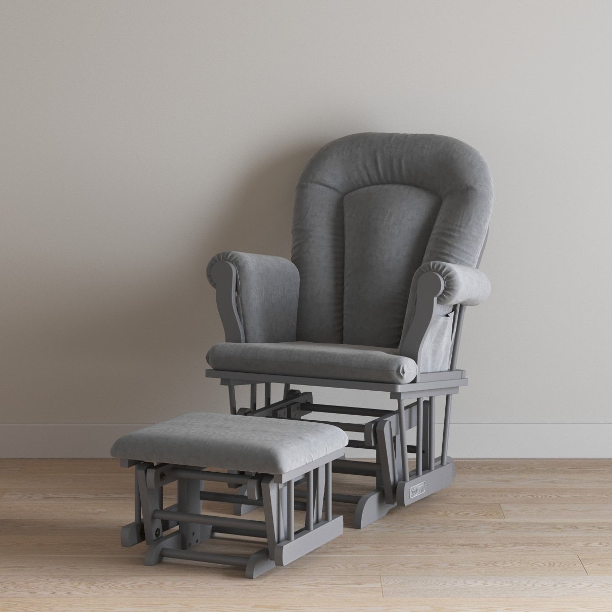 The Child Craft Cozy Glider and Ottoman in Cool Gray, with padded armrests and a matching ottoman, sits on a light wood floor against a beige wall, making it a cozy nursery chair option.