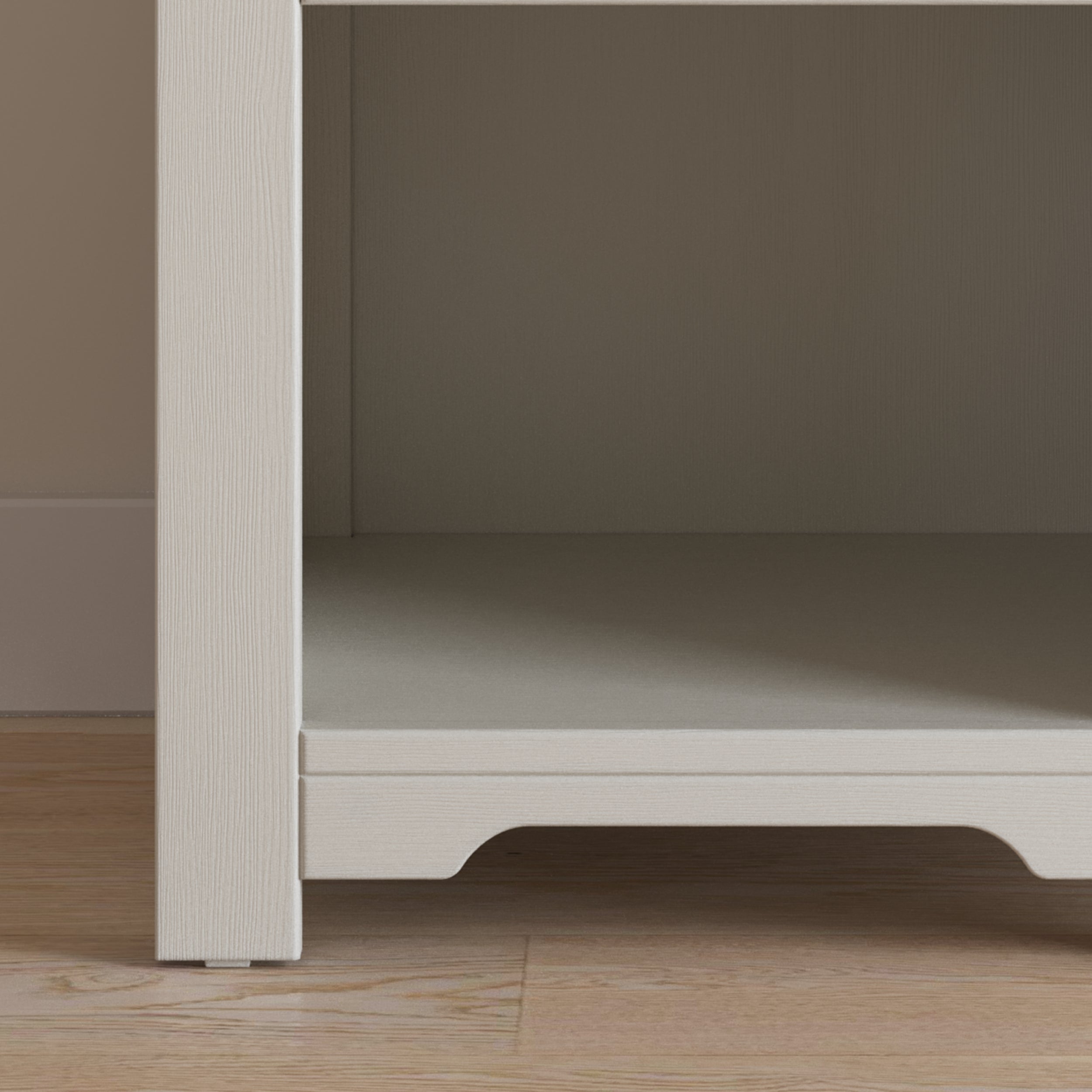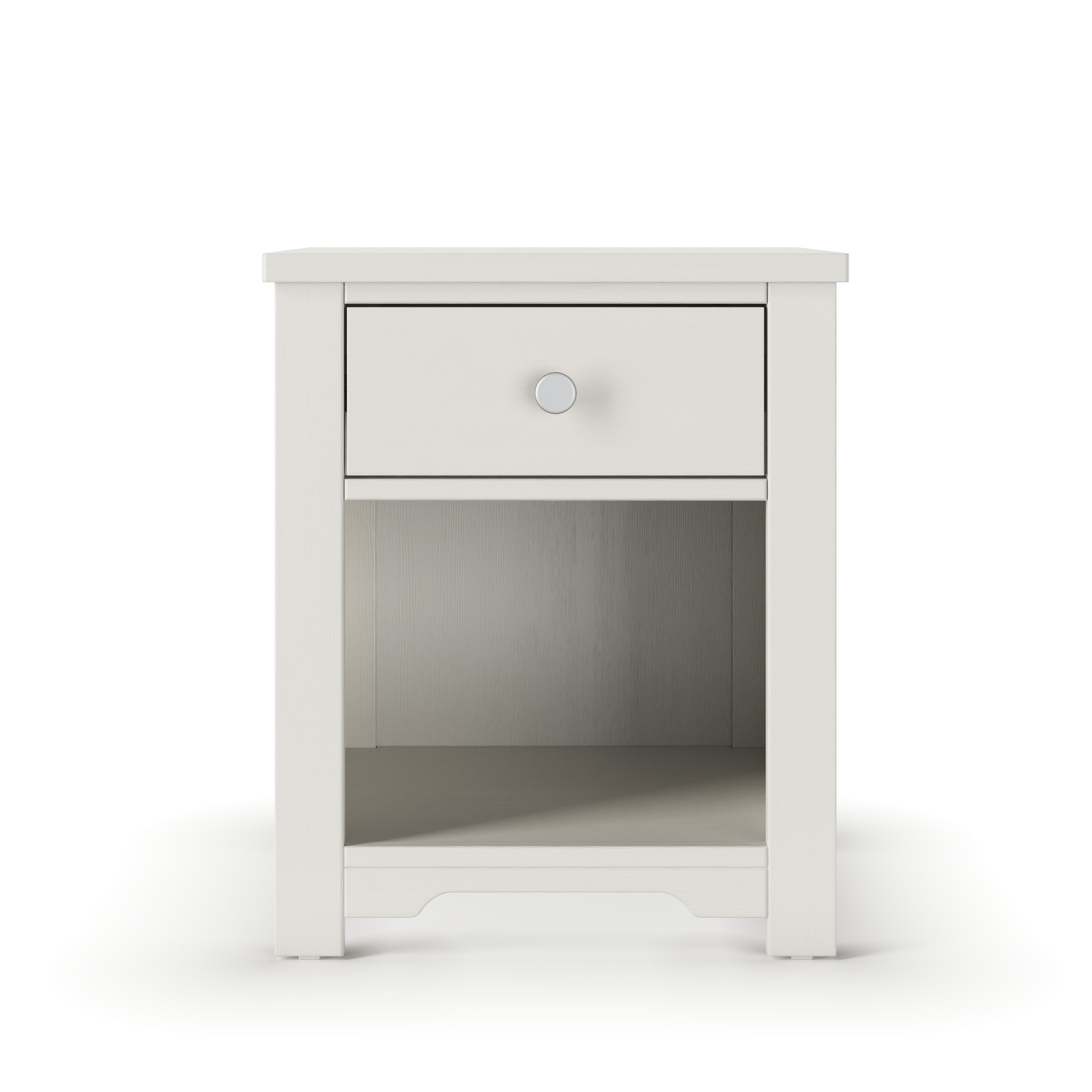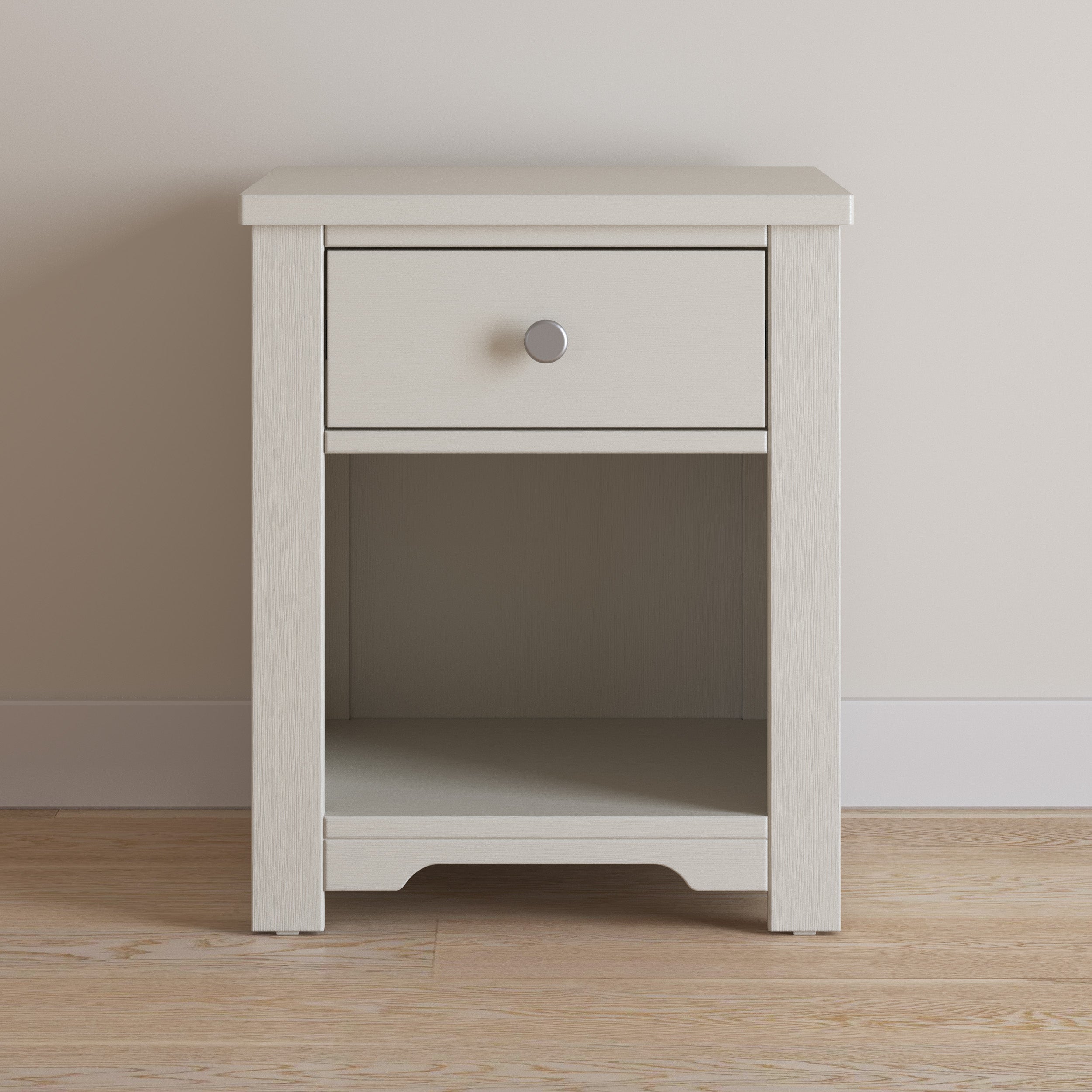 The Harmony Nightstand by Child Craft in Brushed Cotton features a drawer and open shelf, holding a lamp, two books, and a mug on top, with a wooden decor piece below. It sits beside a bed with light bedding.