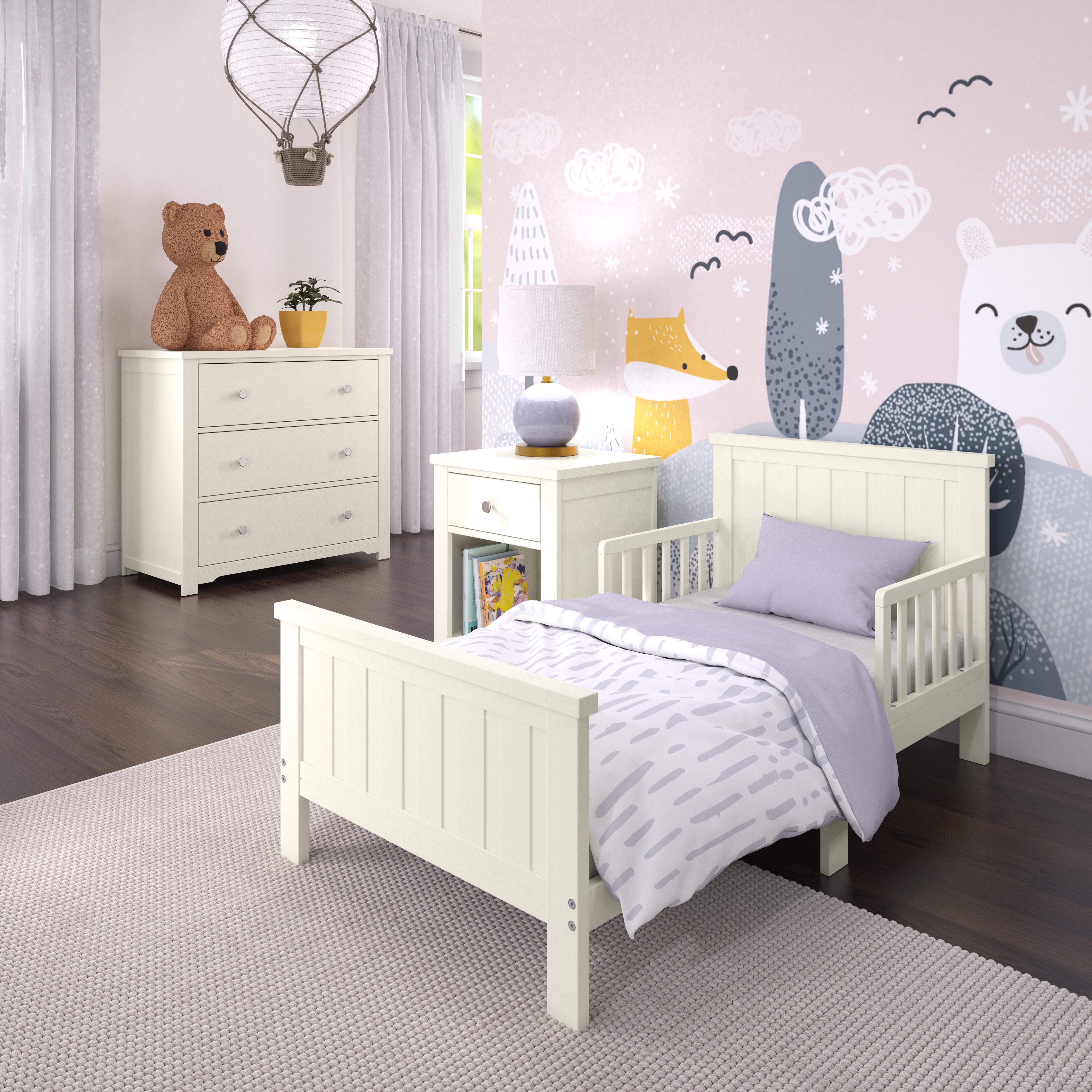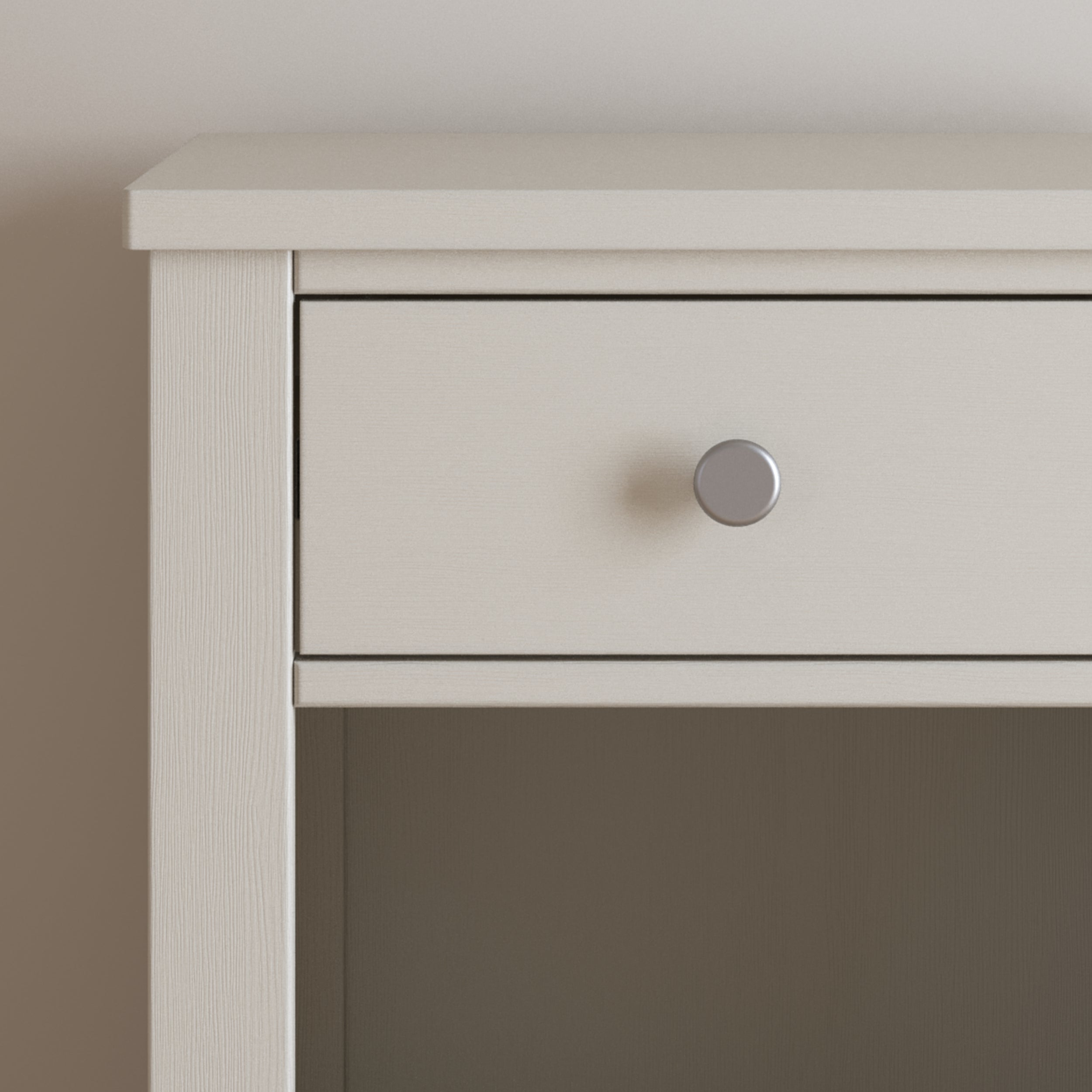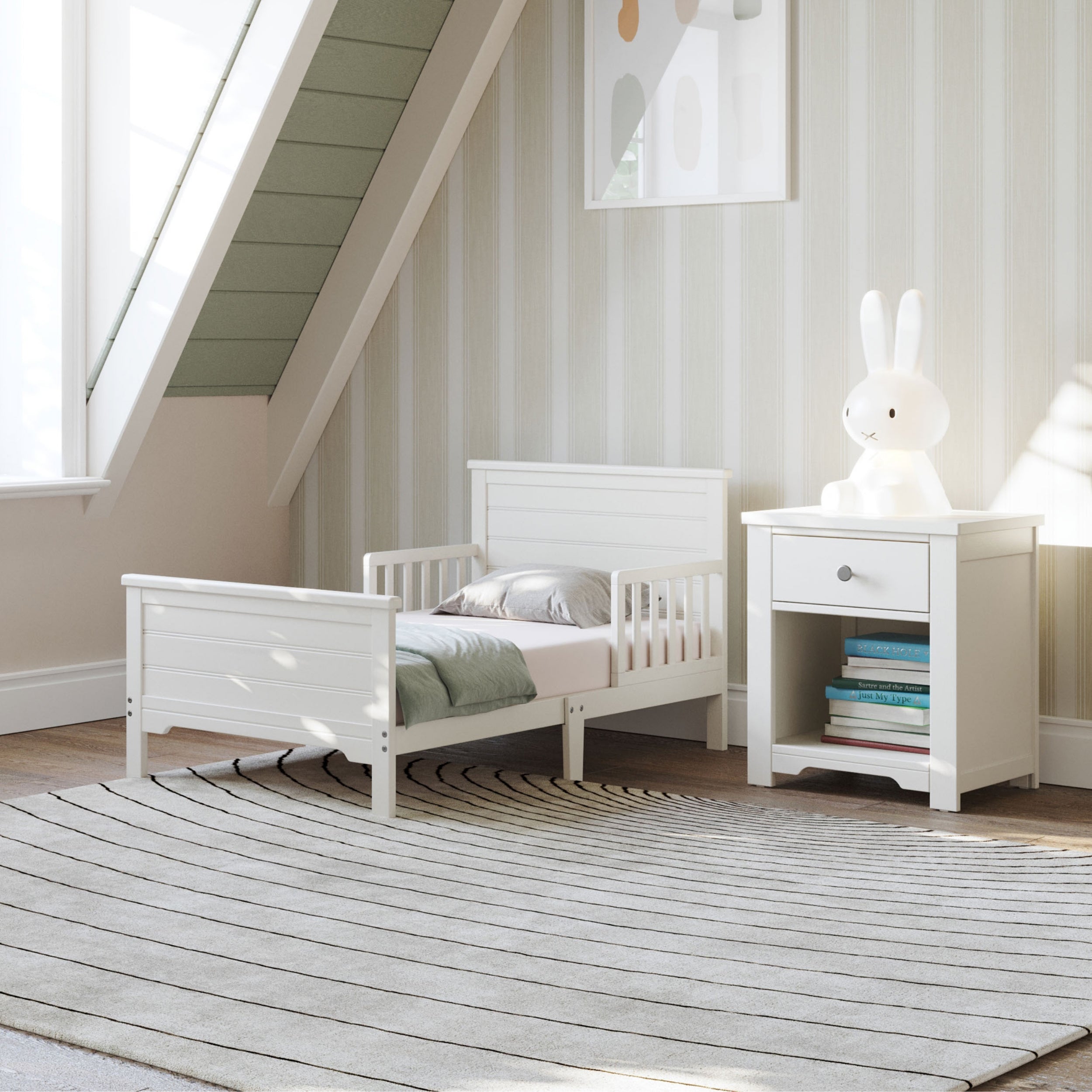 The Harmony Nightstand by Child Craft in Brushed Cotton features a drawer and open shelf, holding a lamp, two books, and a mug on top, with a wooden decor piece below. It sits beside a bed with light bedding.