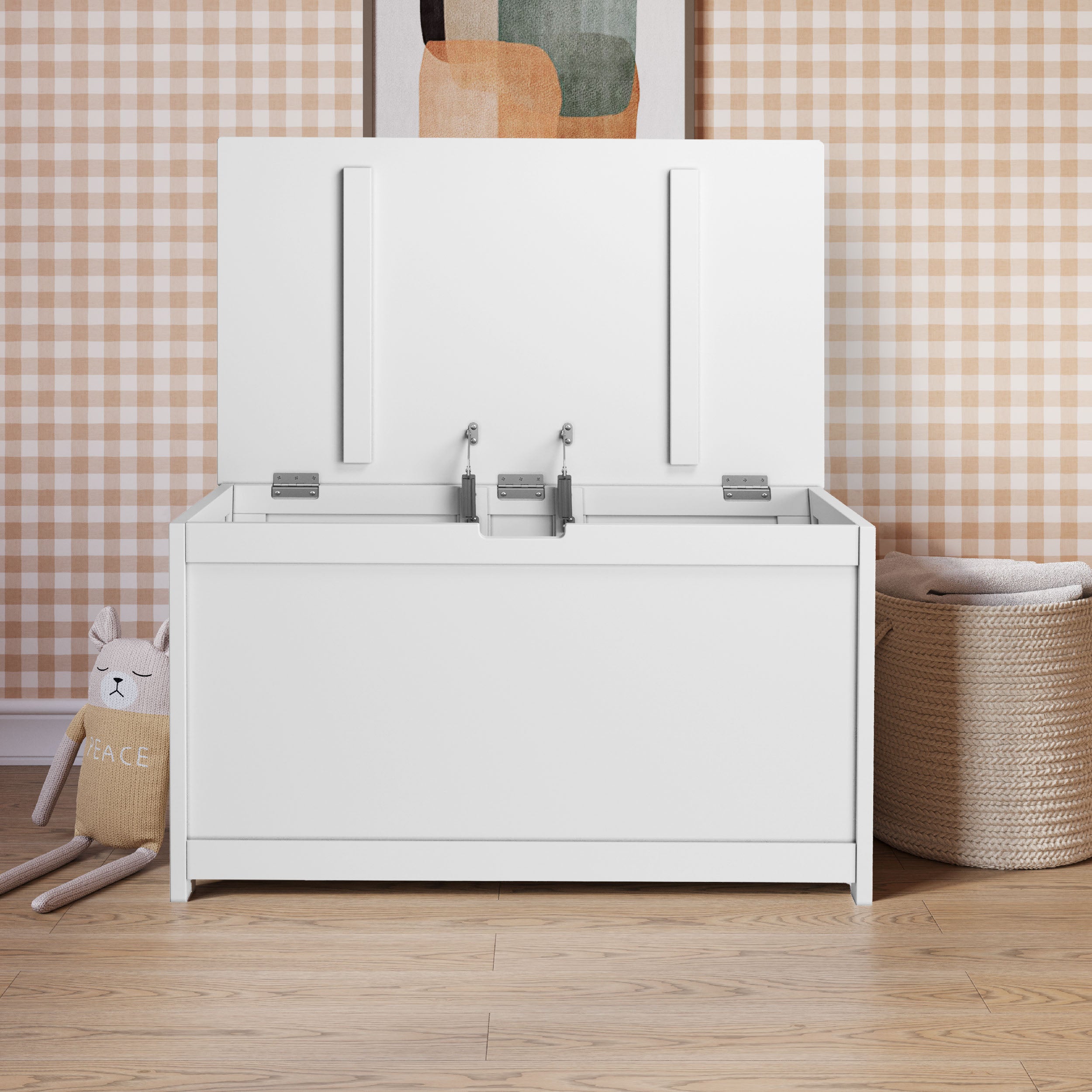The Child Craft Harmony 33" Kids Toy Box in matte white sits against a brown gingham wallpapered wall, topped with an abacus, books, and framed art. On the wooden floor lie a plush bunny and woven basket, creating a charming, child-safe storage space.