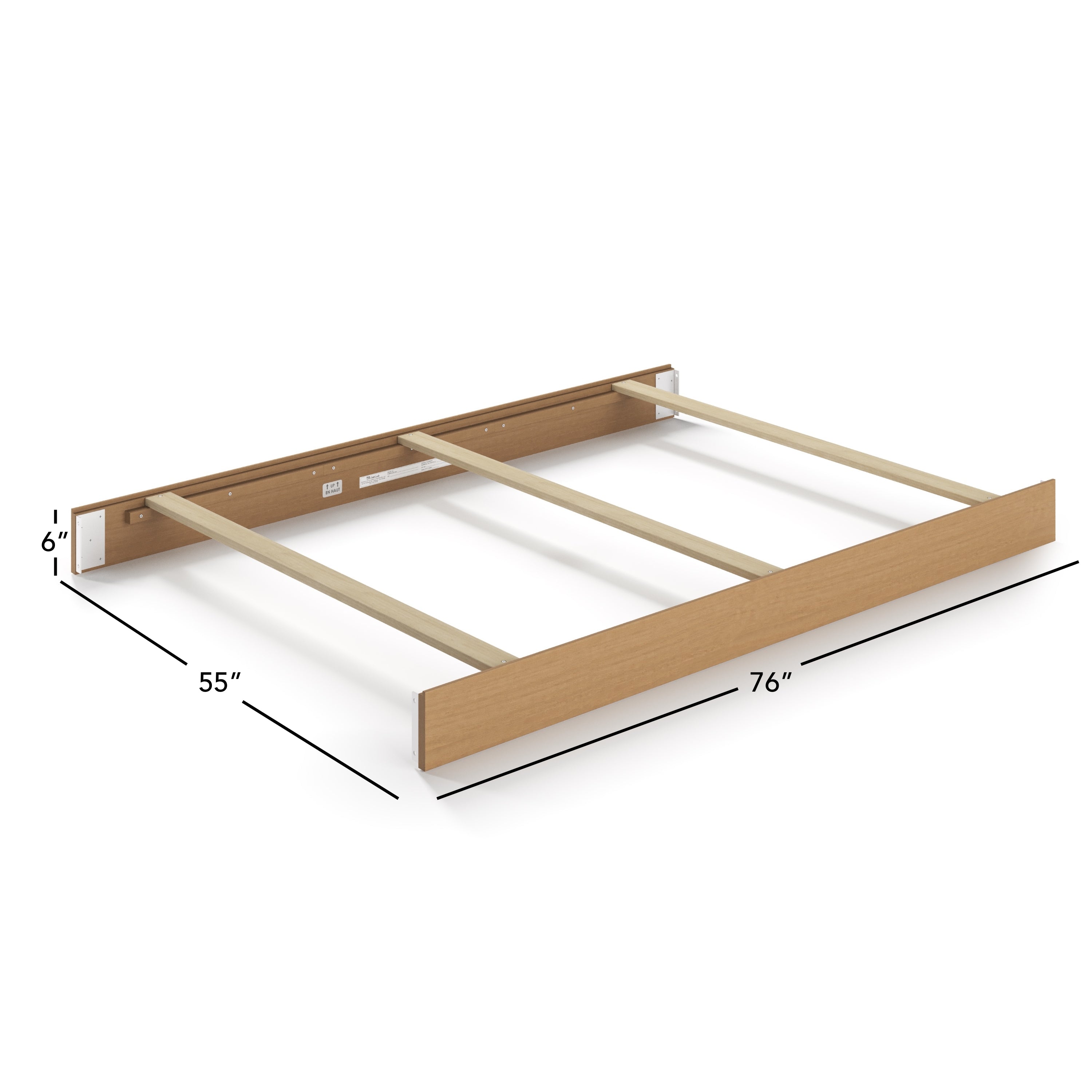The Child Craft F06424 Full-Size Bed Rails in Biscotti, featuring a headboard, footboard, and three metal support slats, are shown against a white background—ideal for crib conversion or full-size bed use.