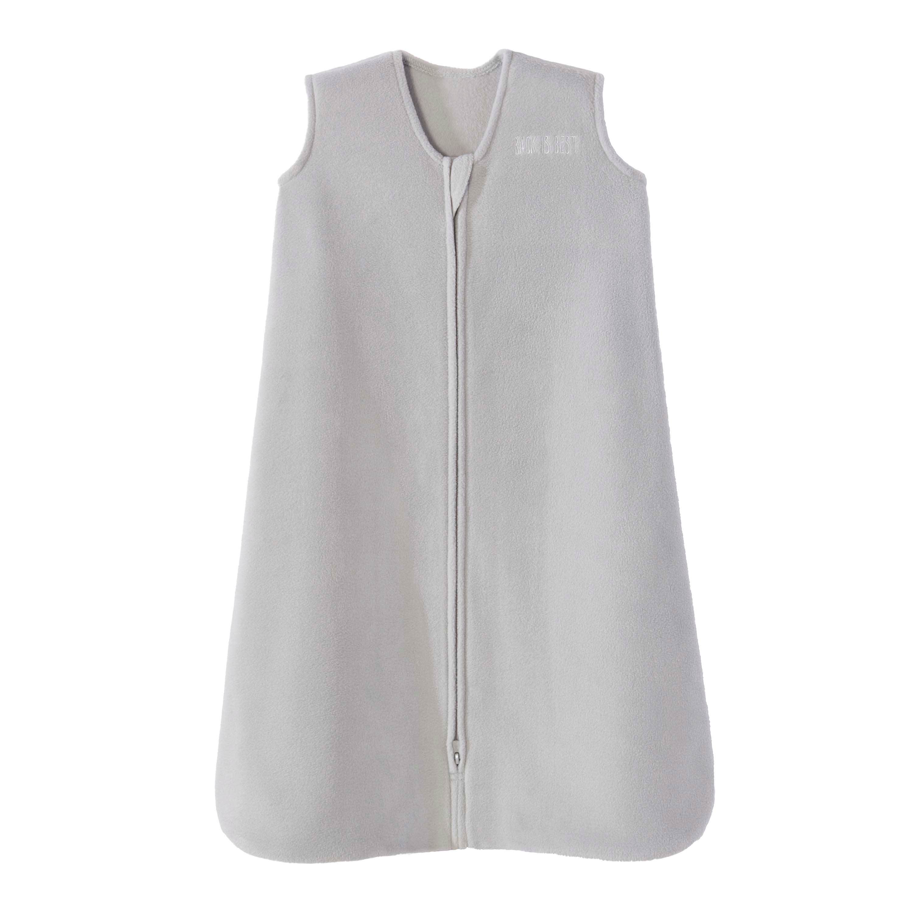 The HALO Wearable Blanket Micro-Fleece TOG 1.0 is a sleeveless, light gray baby sleeping bag crafted from soft microfleece, featuring a front zipper and rounded bottom edges for safe sleep.