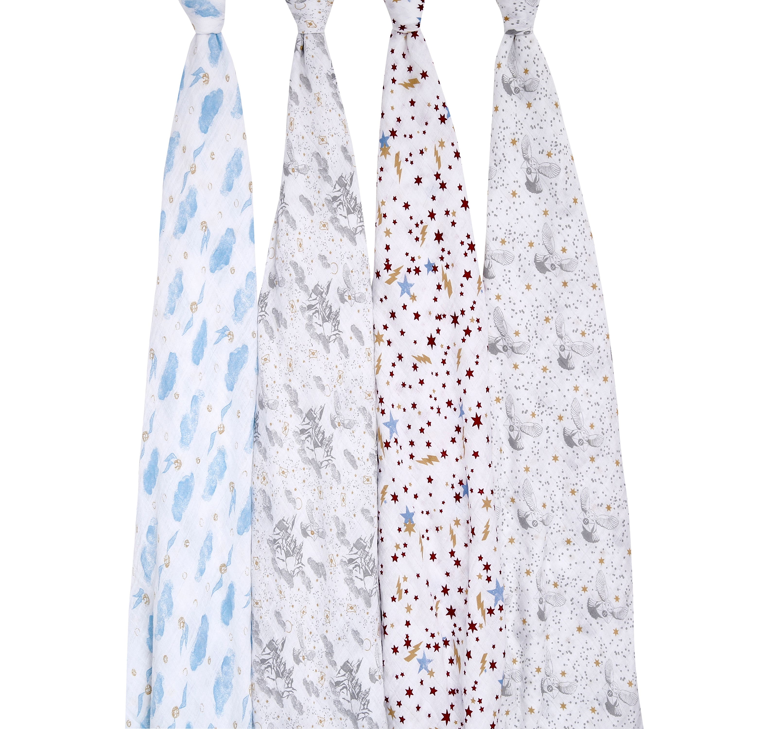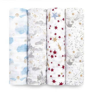 The boutique iconic 100% cotton muslin swaddle blanket 4 pack by aden + anais features enchanting Harry Potter-themed designs: blue snitches, magical castles, stars with lightning bolts, and owls surrounded by stars in a charming palette of blue, gray, red, and gold on white.