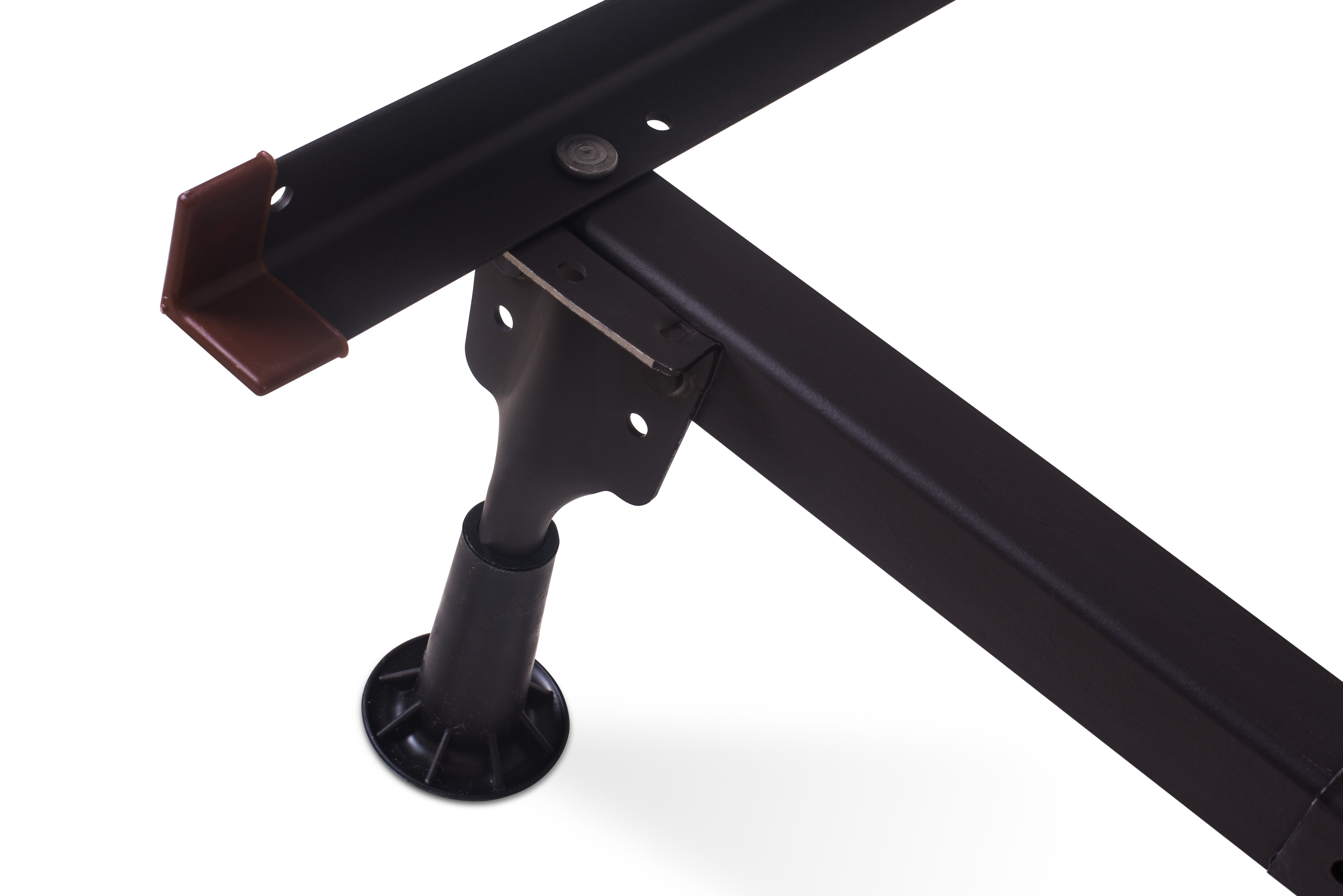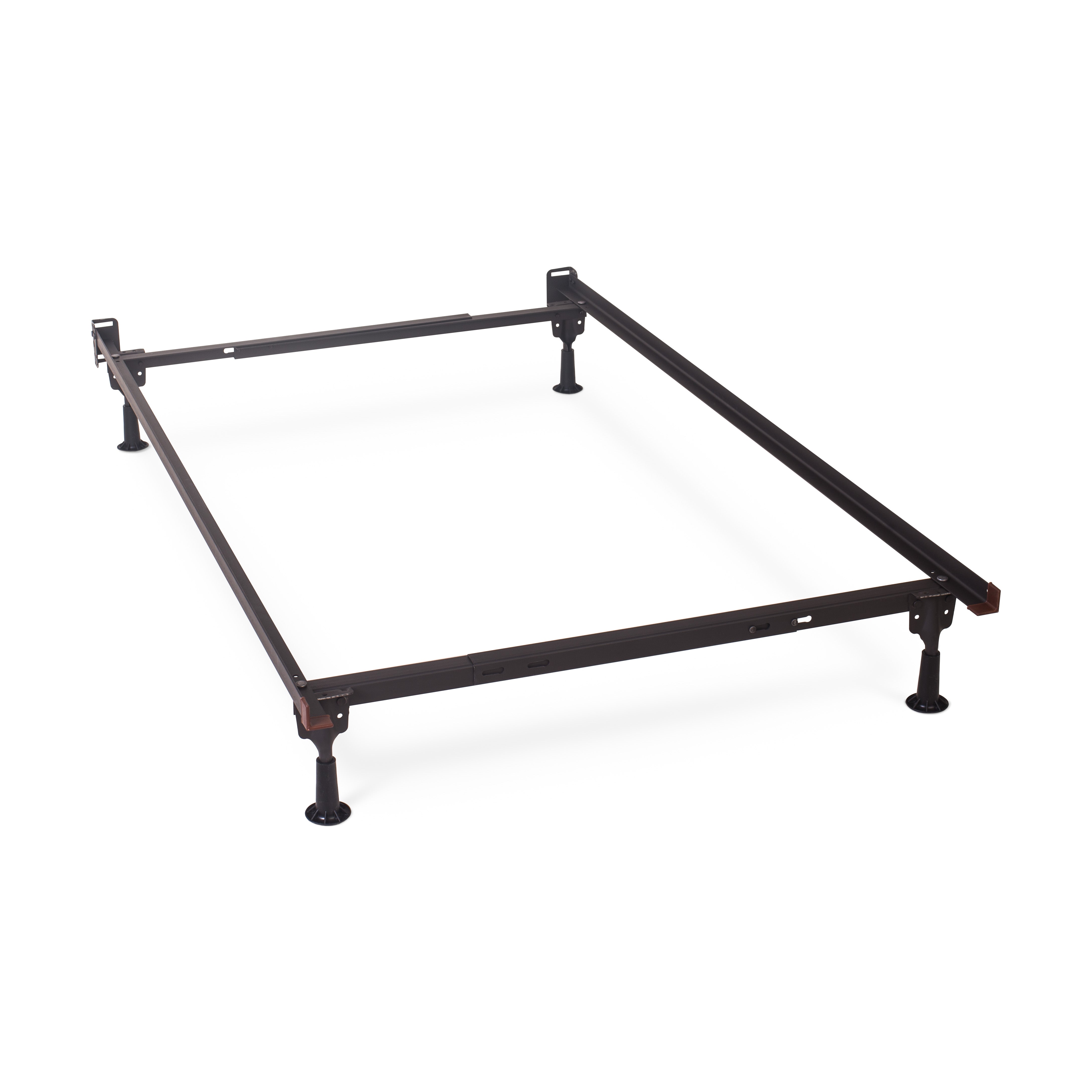 The Child Craft Hollywood Metal Bed Frame features a black, rectangular metal design with four legs. Shown on a white background, it’s perfect for use with a Hollywood Full Size Conversion Kit, transforming your crib into a sturdy, minimalistic full-size bed.