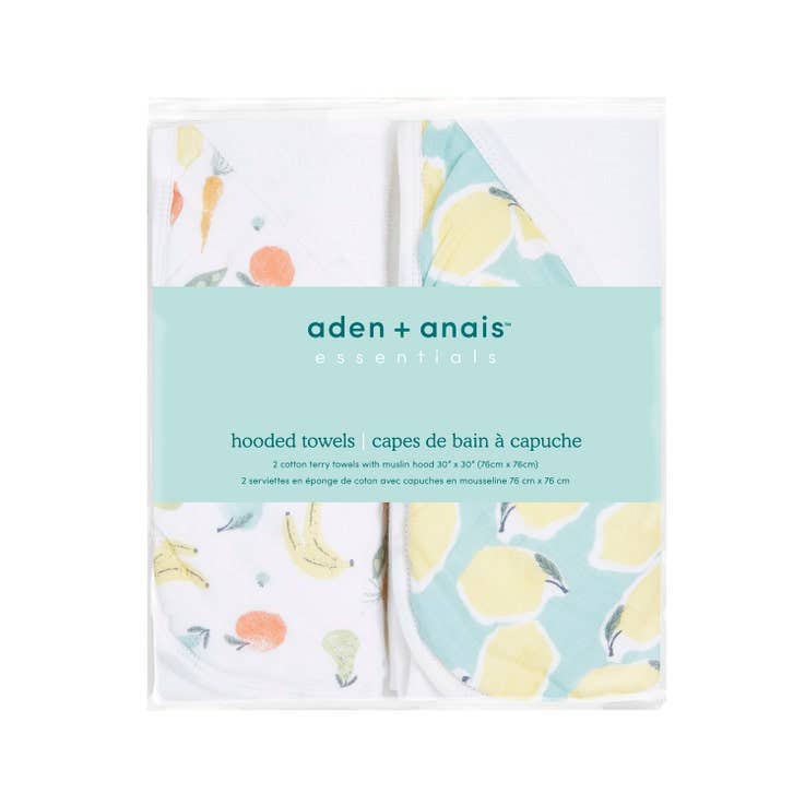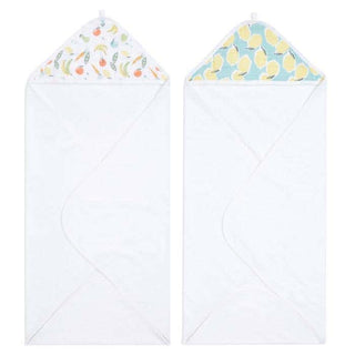 The aden + anais essentials cotton muslin hooded towels 2 pack features super absorbent white towels. The left towel has a fruit pattern with oranges and peaches inside the hood, while the right displays vibrant lemons on a blue background. Crafted from plush cotton terry for ultimate comfort.