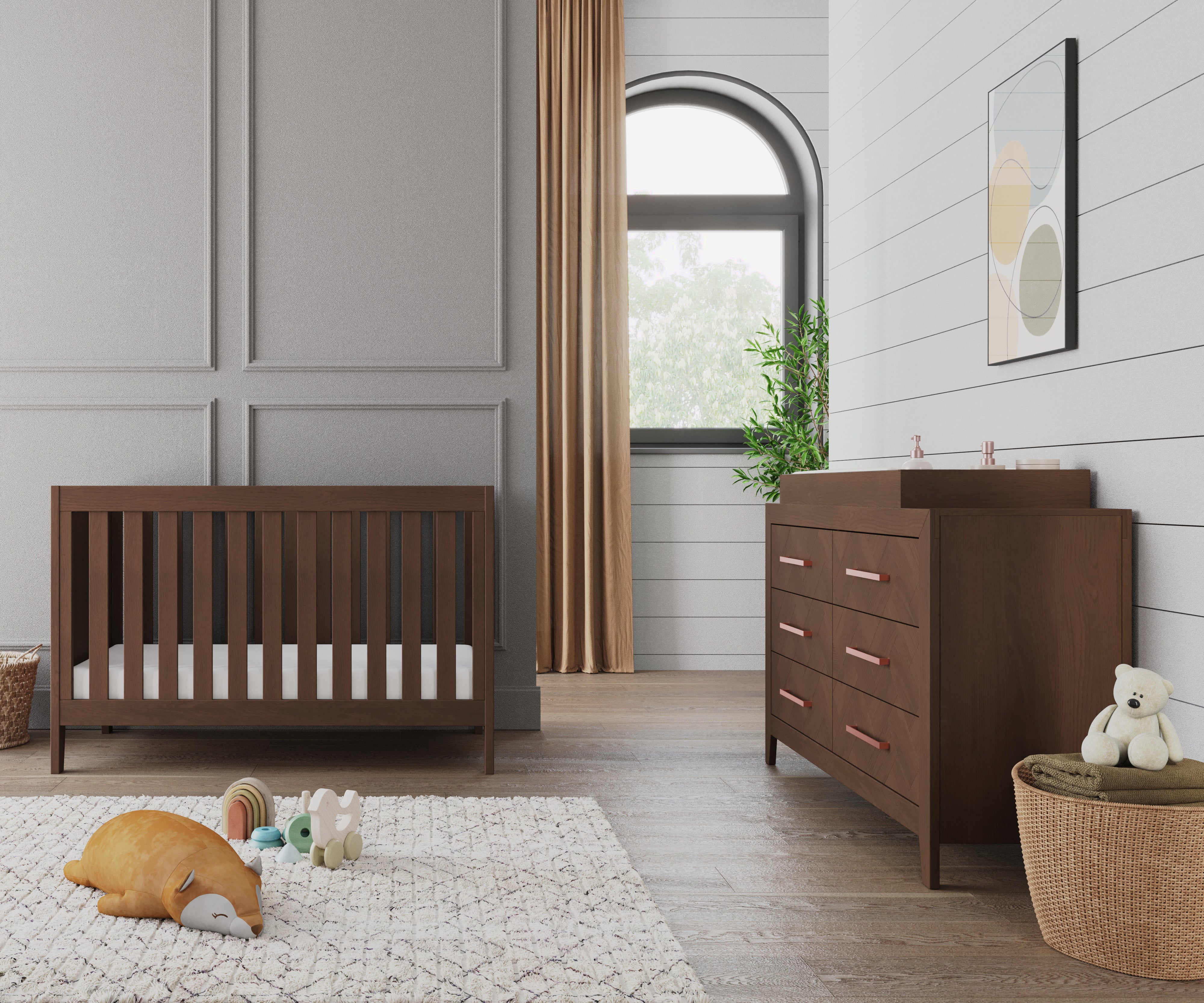 A modern nursery features the Child Craft Kieran 5-Drawer Chest in Toasted Chestnut, paired with a matching wooden crib and dresser. Beige curtains, indoor plants, toys, and a soft rug add cozy touches to the stylish room.