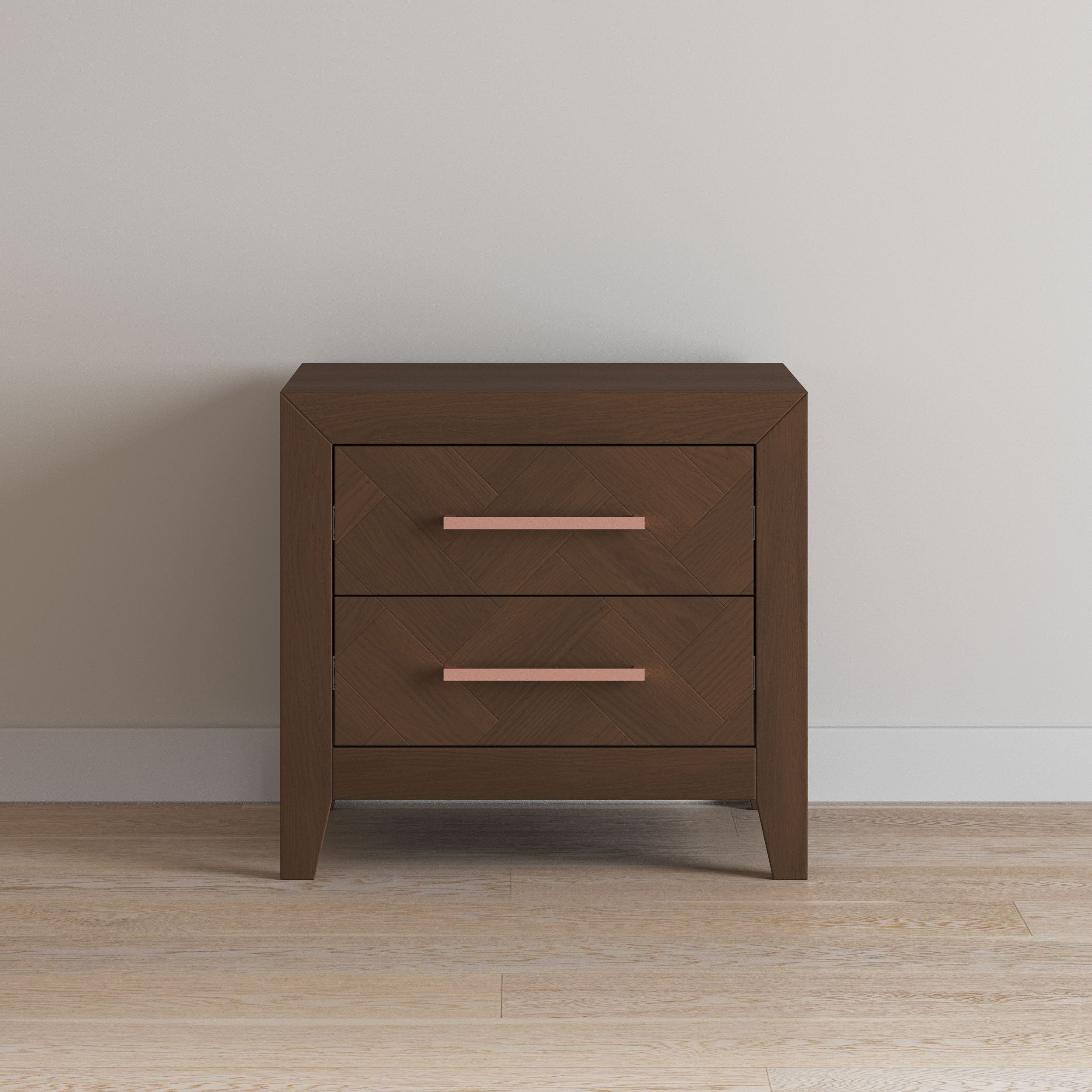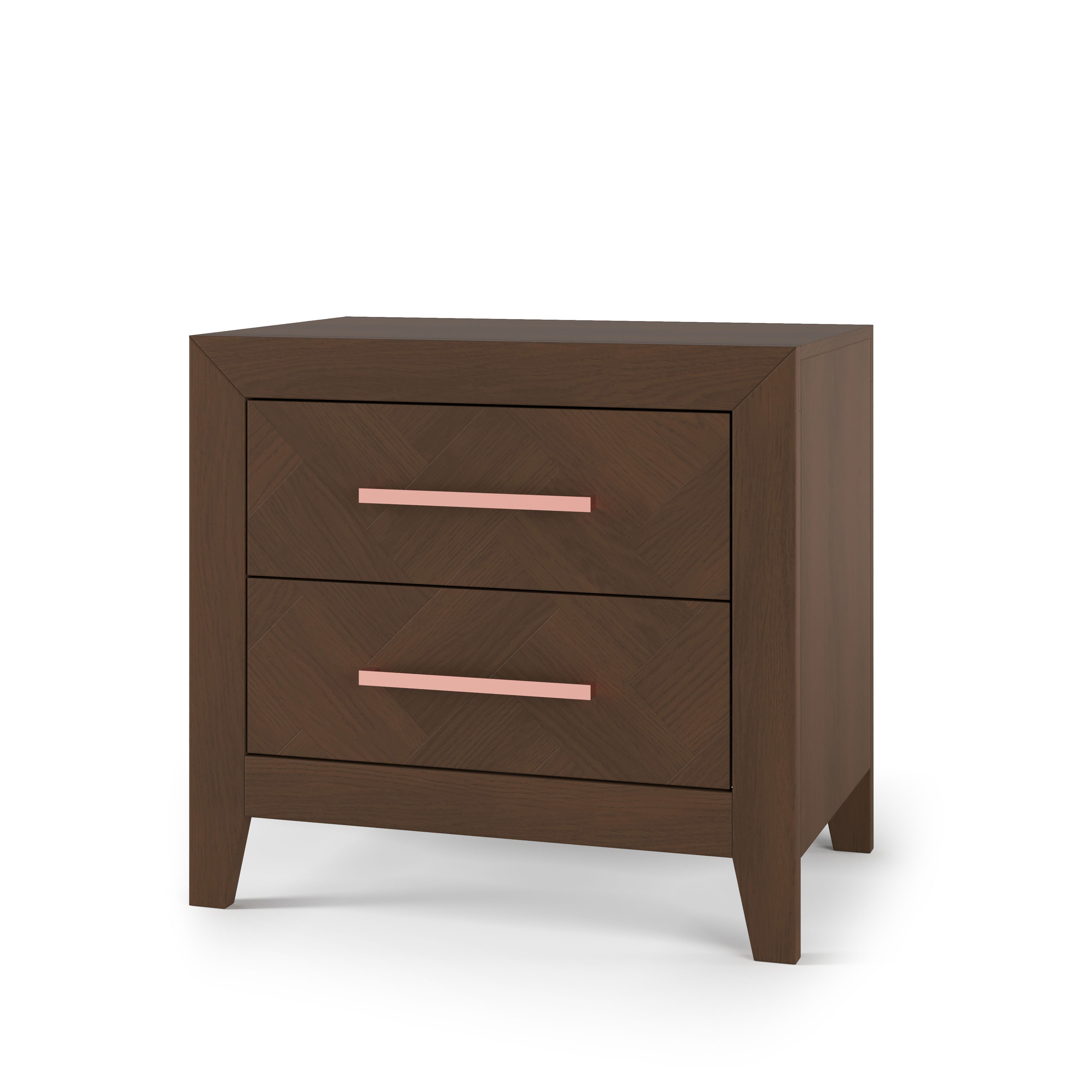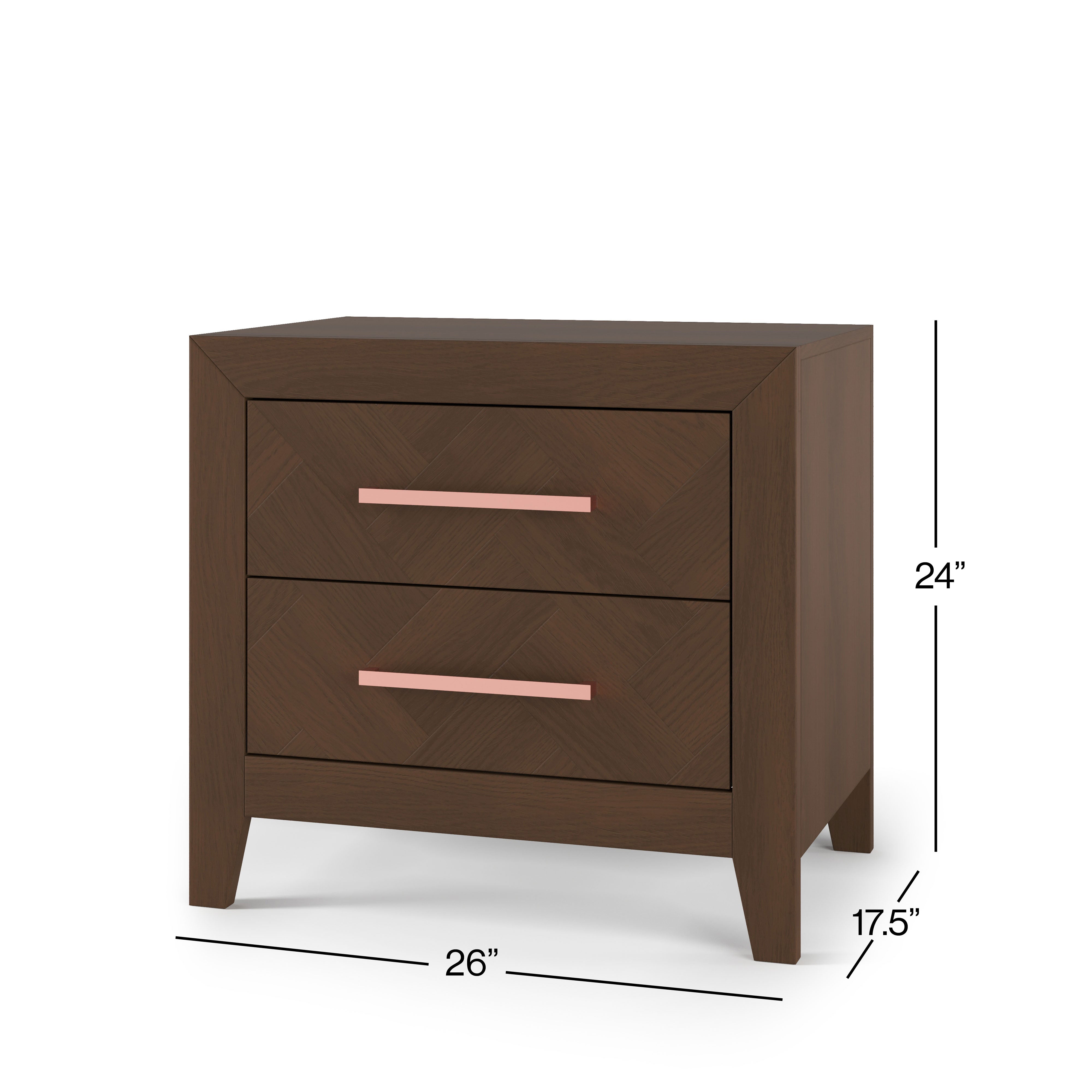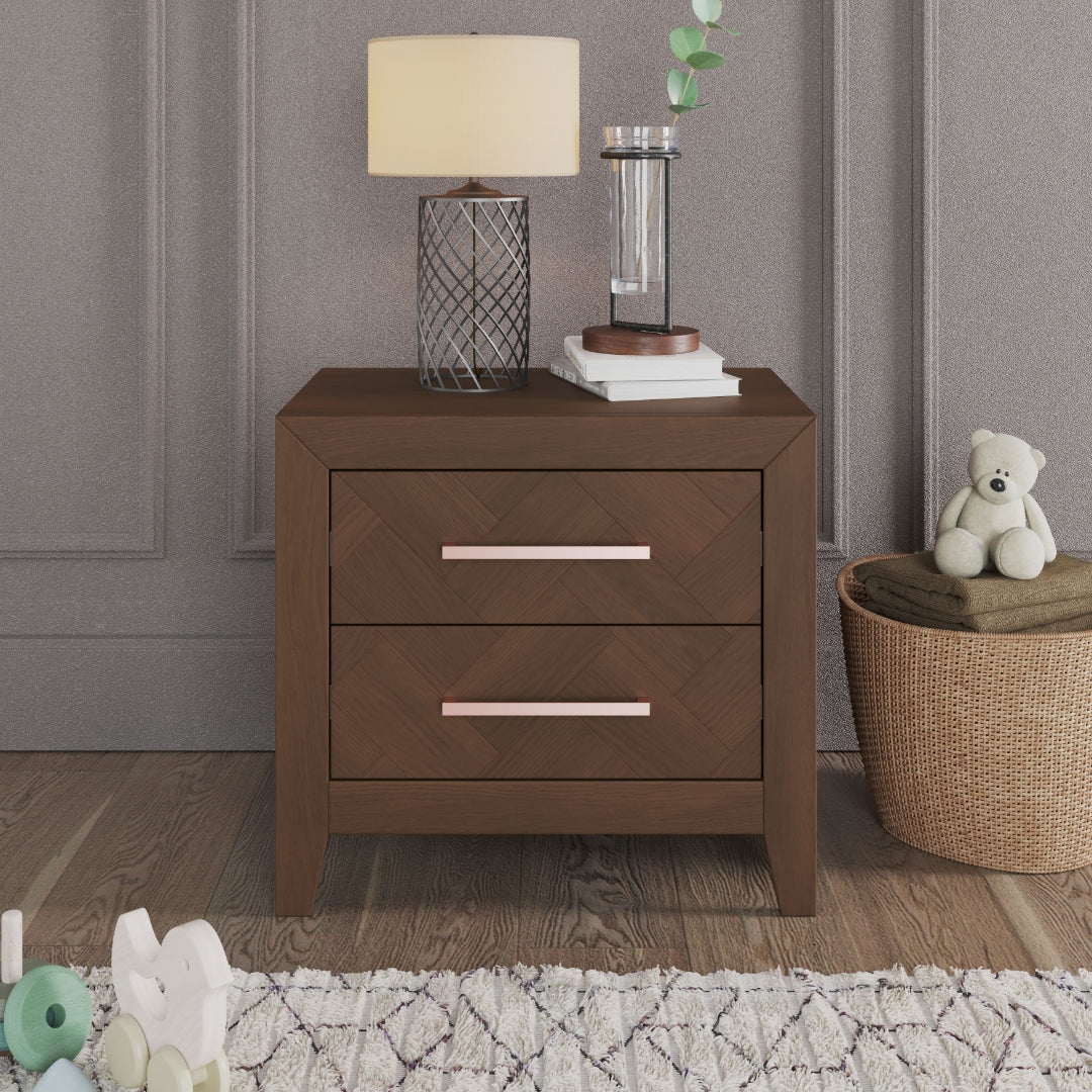 The Child Craft Kieran Nightstand in Toasted Chestnut with two drawers provides ample bedside storage against a gray paneled wall, topped with a lamp, books, and water. A nearby toy basket makes it ideal for a baby’s nursery.