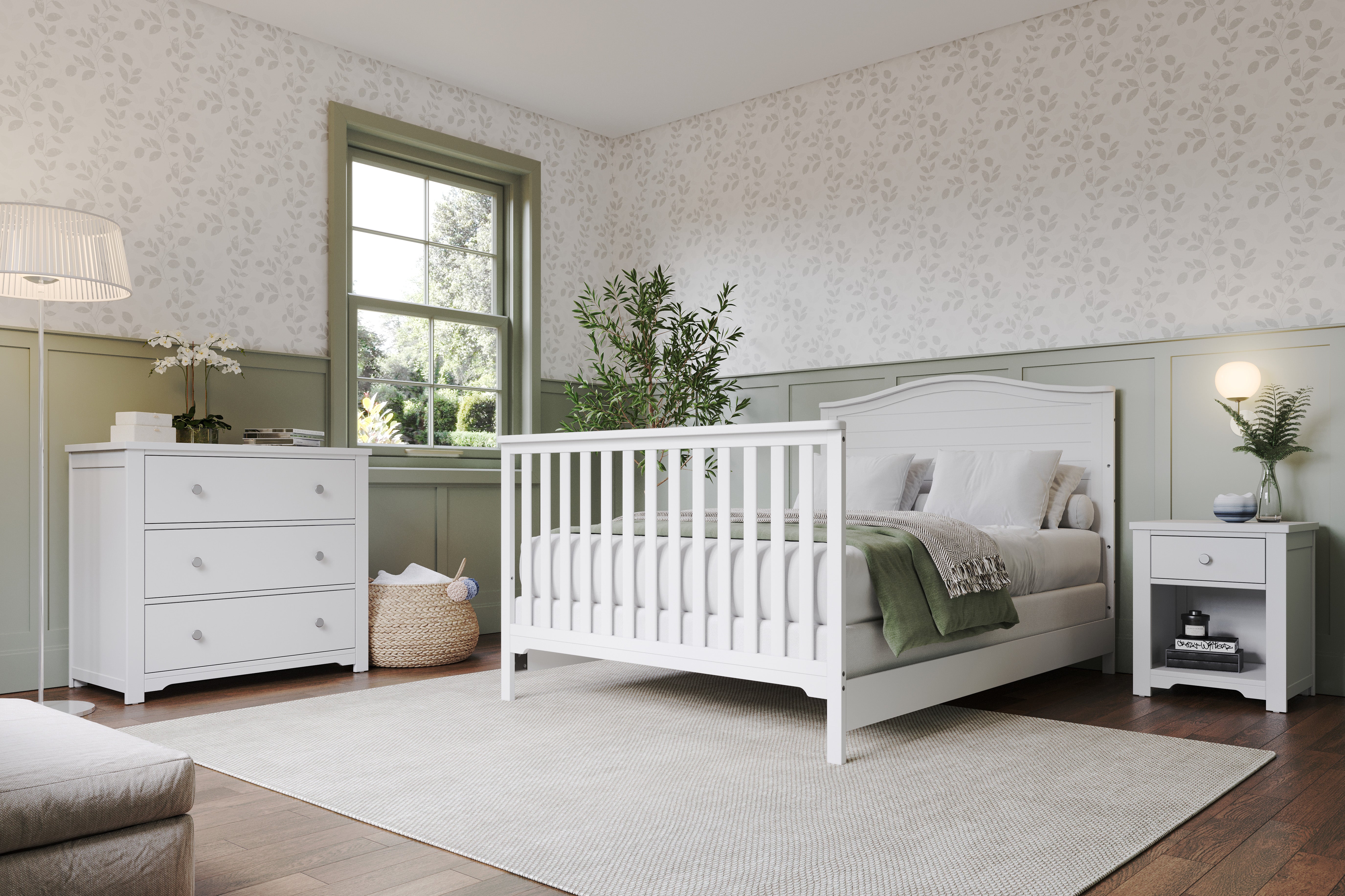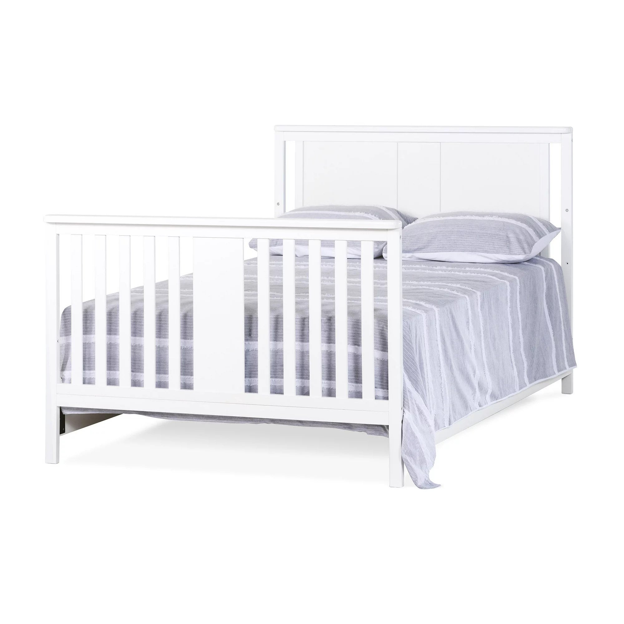The Child Craft F06401 Full-Size Bed Rails in matte white are shown partially assembled, connecting a white headboard and footboard with three light pine rails, all set against a white background.