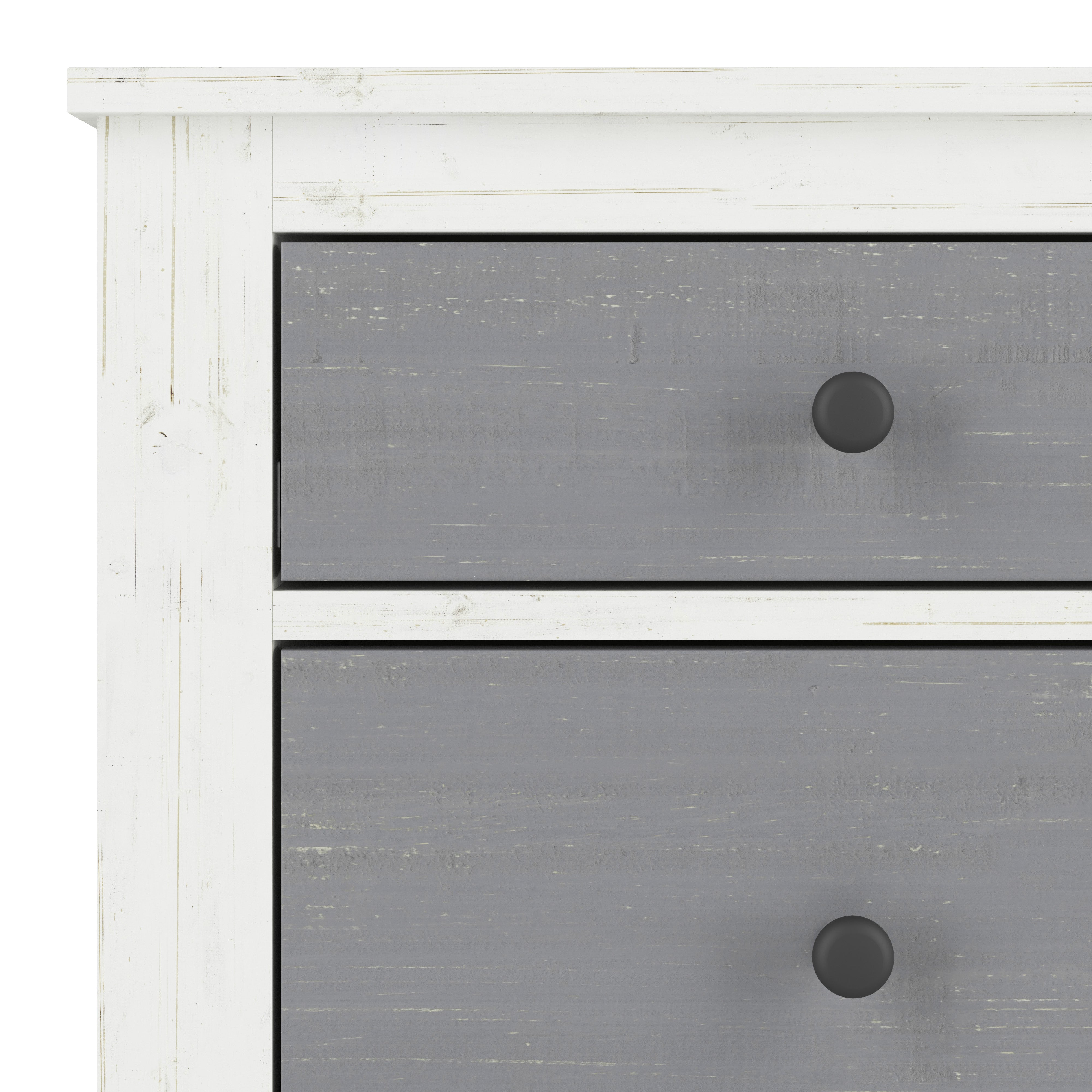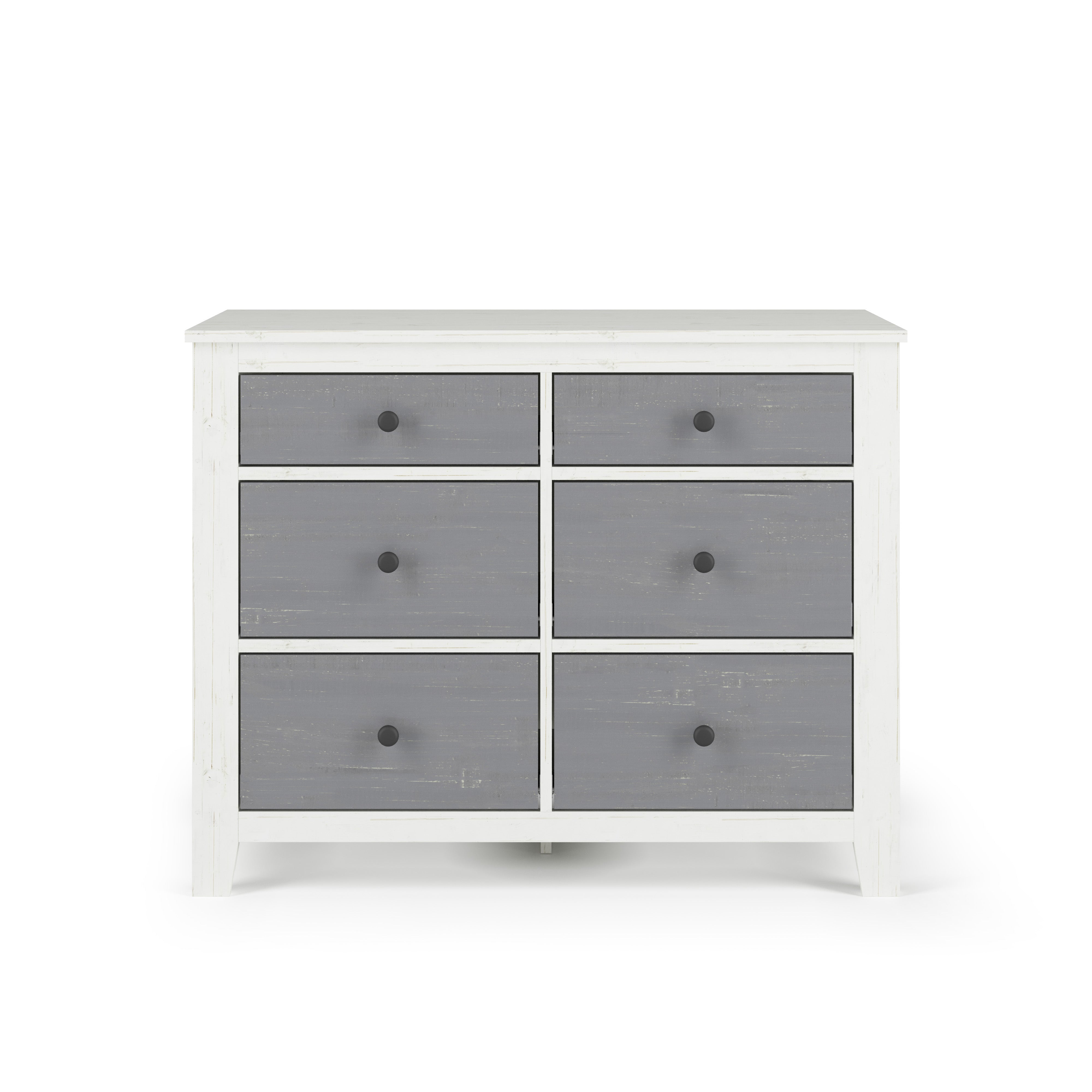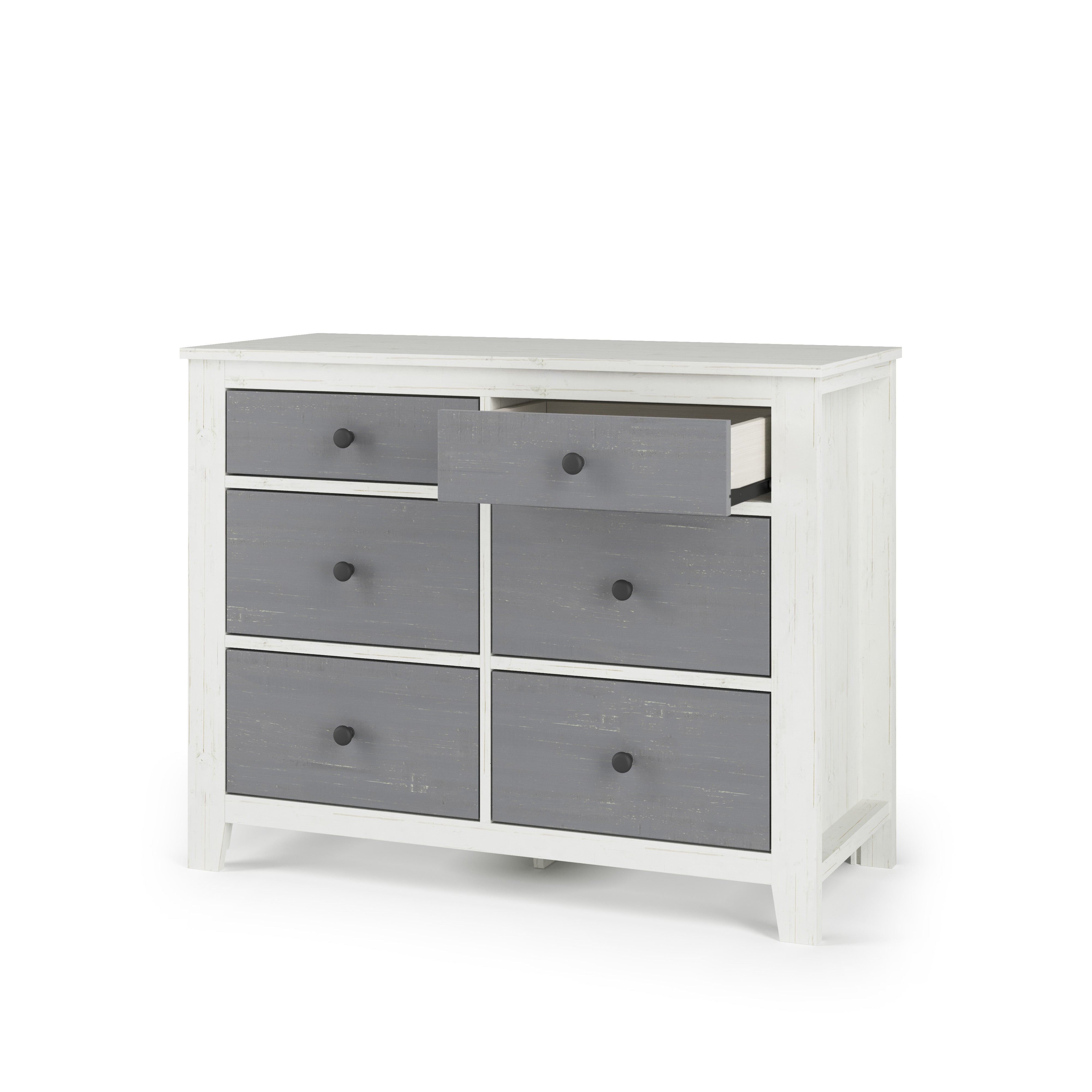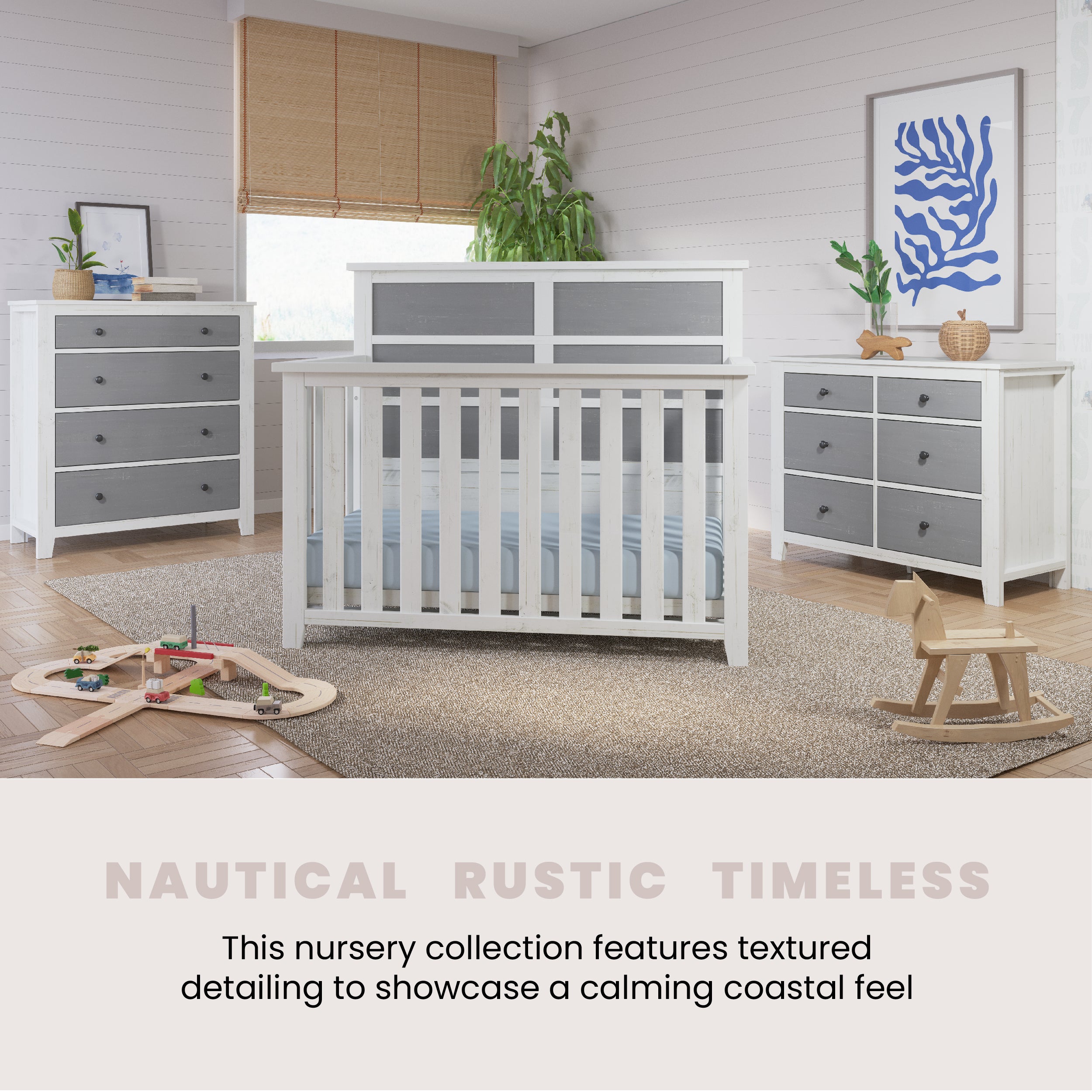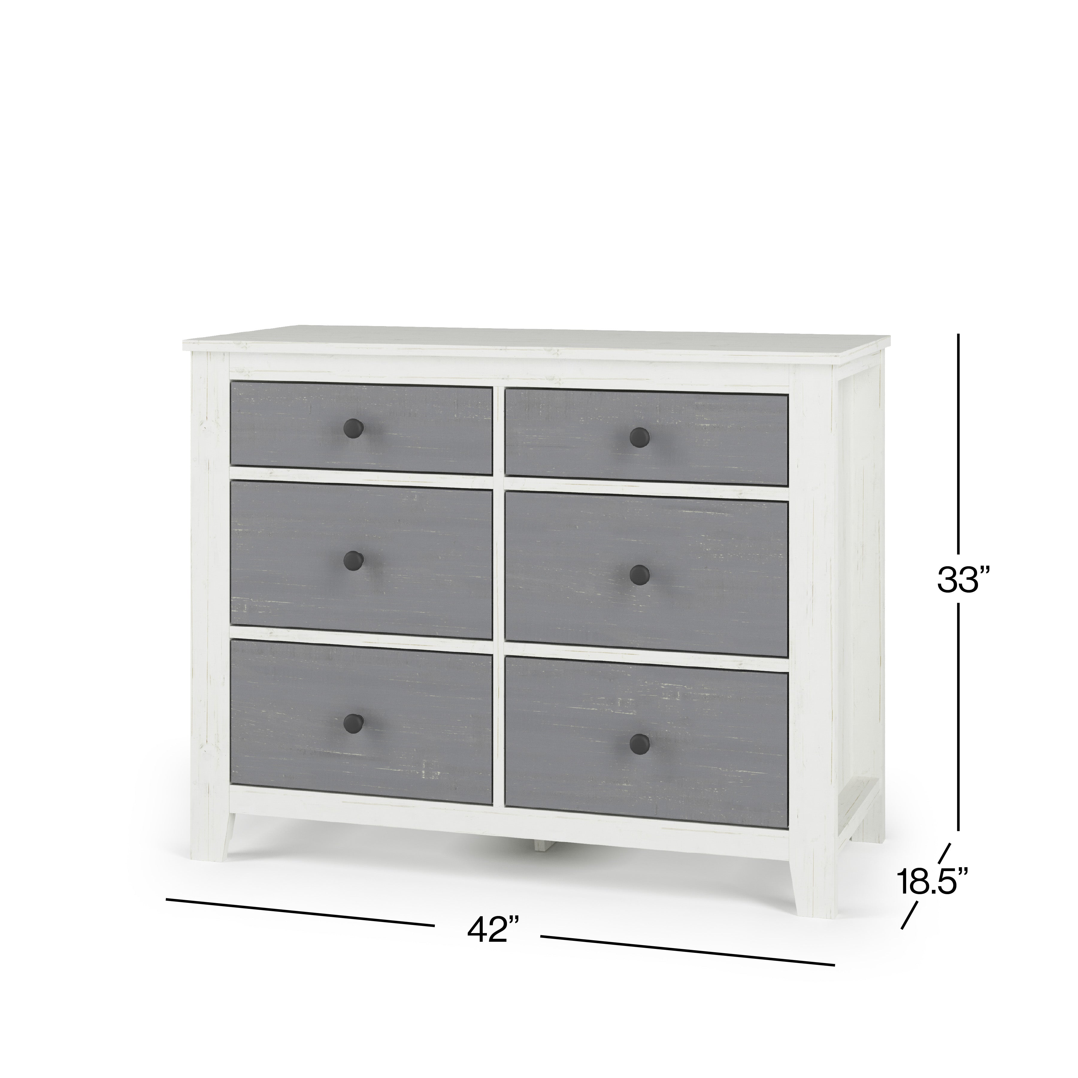 The Child Craft Ocean Grove Double Dresser in White/Gray features six dark gray drawers and stands on a wood floor, making it ideal nursery furniture. Accessories like a plant and art add nautical farmhouse charm.