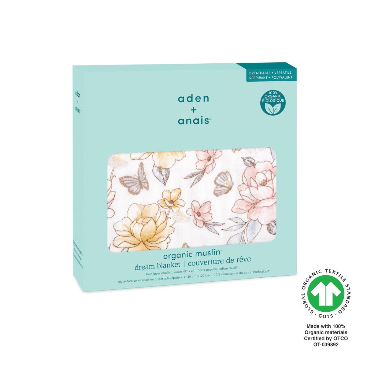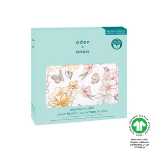 Aden + anais organic cotton dream blanket features a folded design with floral patterns of yellow and pink flowers, green leaves, and butterflies on a white background. Made from soft cotton muslin fabric, its layered to highlight texture and is GOTS certified for peace of mind.