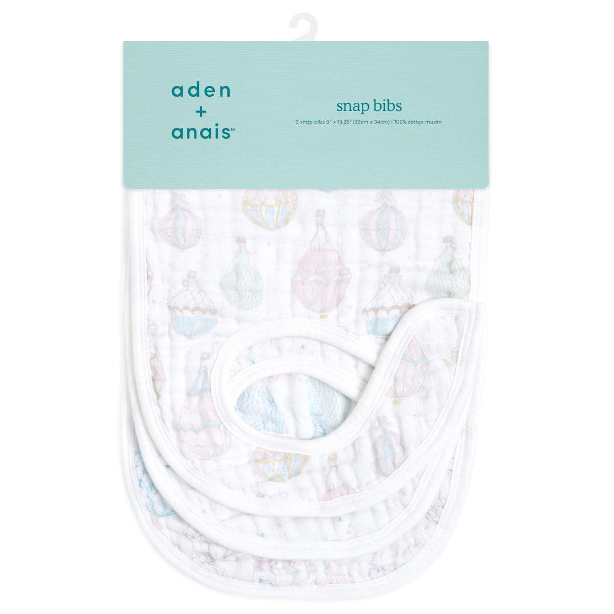 The aden + anais organic cotton snap bibs 3 pack features pastel patterns: one polka dot and two with abstract designs of hot air balloons and clouds. These GOTS-certified bibs ensure your little ones comfort while being eco-friendly.