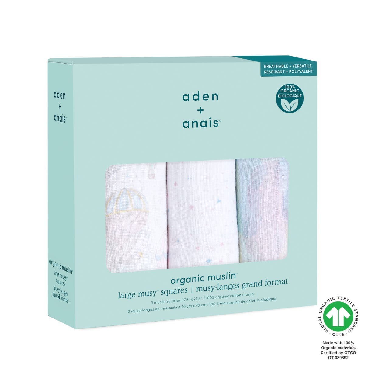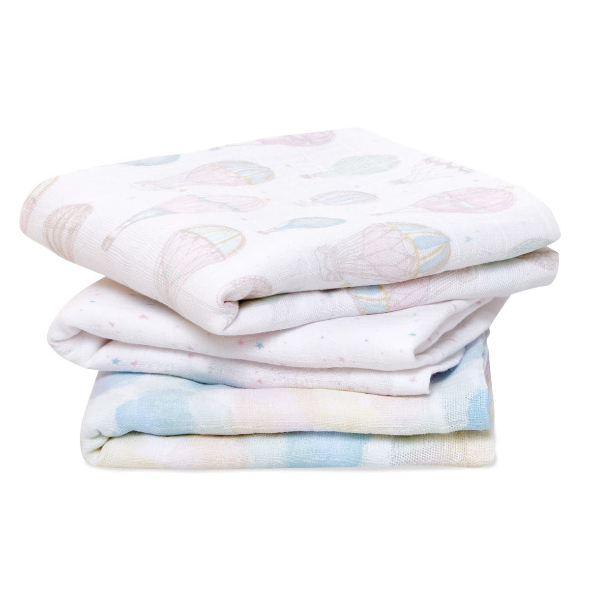 A stack of three soft aden + anais organic cotton muslin squares features a pastel hot air balloon design on top, tiny stars in the middle, and a gradient of gentle hues like blue and yellow on the bottom. These GOTS-certified baby essentials offer peace of mind.