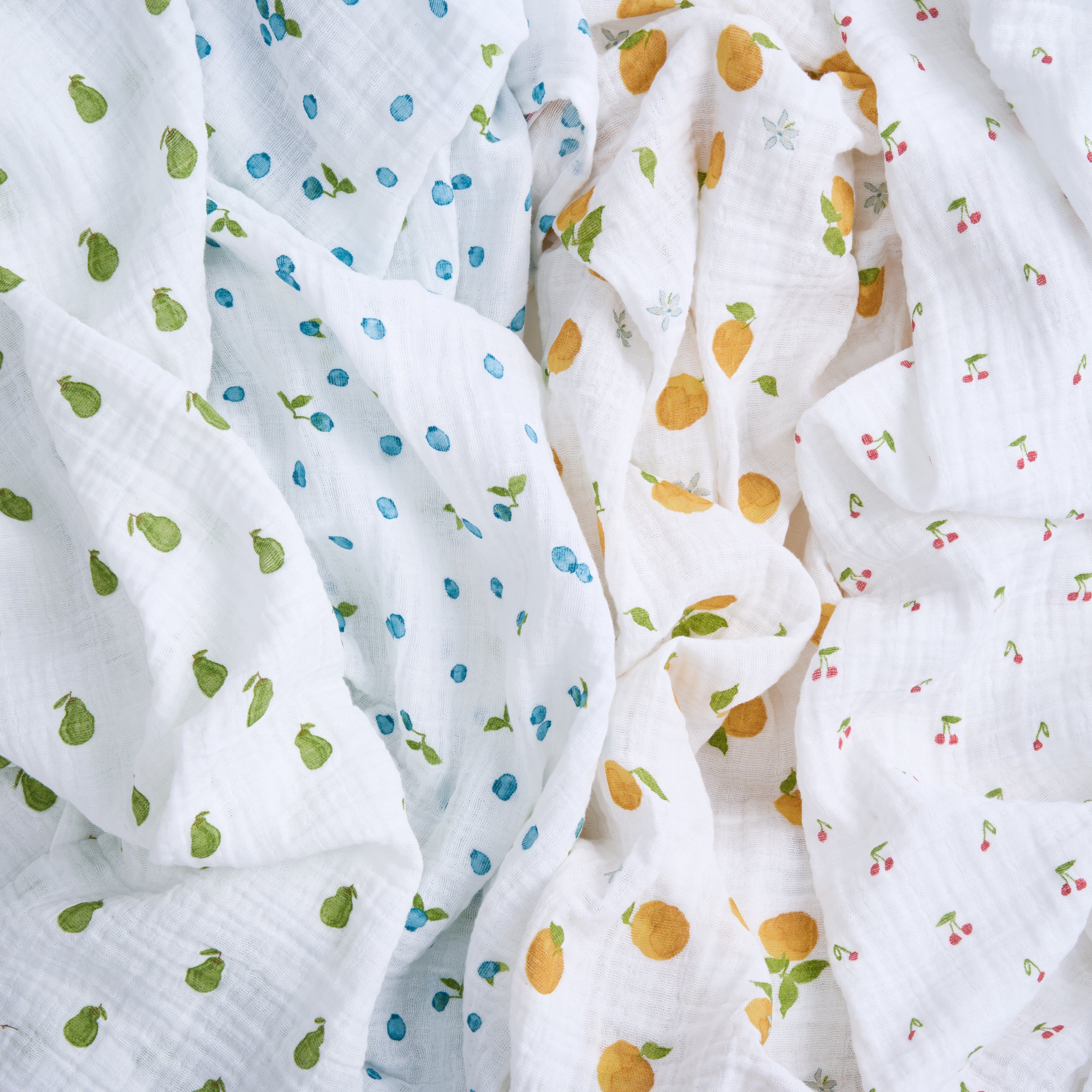 The aden + anais organic cotton muslin swaddle blanket 4 pack features four vertically arranged blankets, each adorned with different fruit patterns: green pears, blue berries, orange oranges, and red cherries—add a playful, sustainable touch to your baby product collection with these GOTS certified cloths.