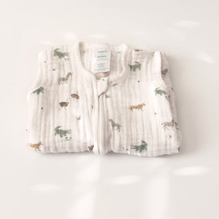 The aden + anais organic cotton light sleep sack TOG 1.0 is a sleeveless, GOTS-certified white muslin sleep sack with a front zipper, decorated with small, colorful animal prints of lions, zebras, and giraffes.