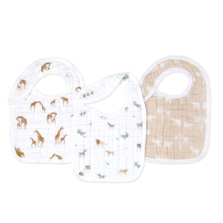 The aden + anais organic cotton snap bibs 3 pack features quilted textures, adjustable fit, and rounded edges. The set includes three bibs: one with giraffes, another with zoo animals, and the third beige with white palm tree patterns.