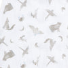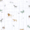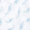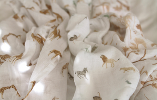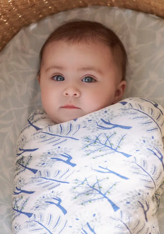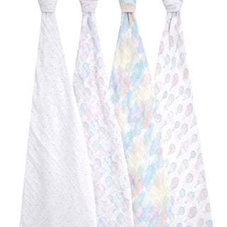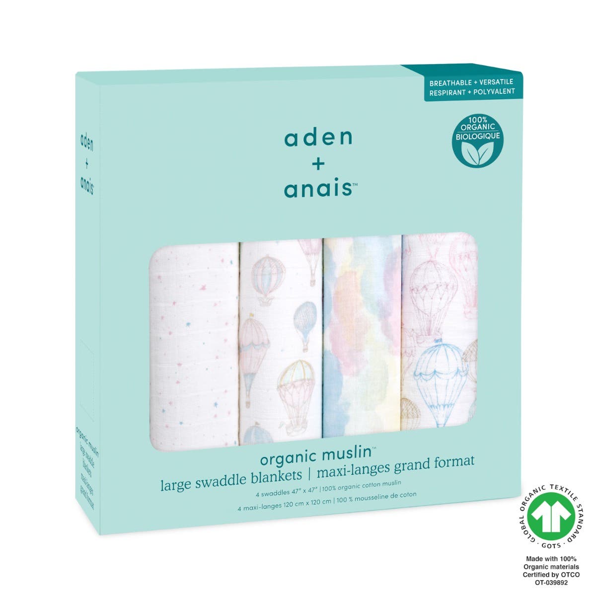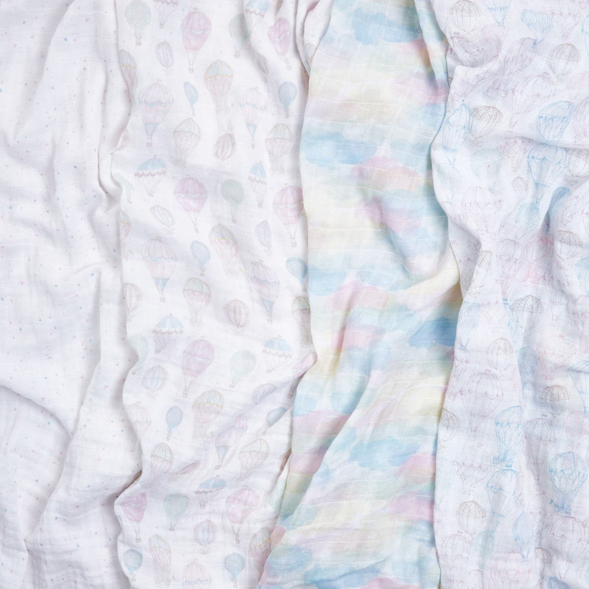 Four organic cotton muslin swaddle blanket rolls by aden + anais are lined up vertically, featuring GOTS certified sustainable designs of pastel stars, colorful hot air balloons, watercolor clouds, and muted-tone balloons.