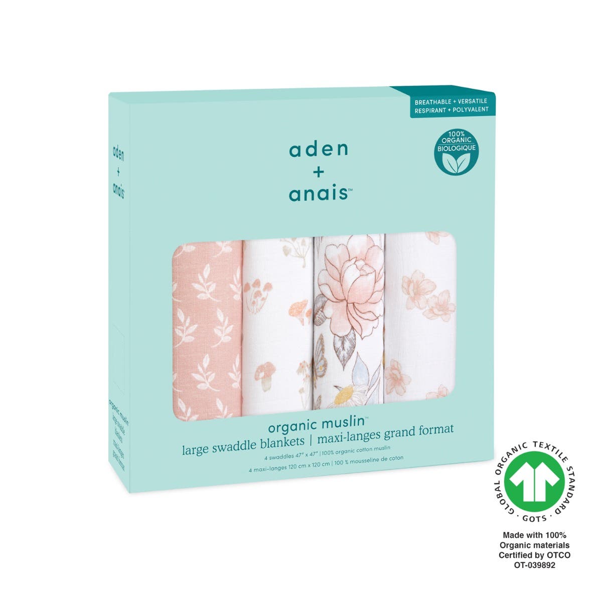 Four aden + anais organic cotton muslin swaddle blankets are displayed: pink with white leaves, white with mushrooms and flowers, white with large pink flowers, and white with small pink flowers. Each blanket is 100% organic muslin and GOTS certified for supreme quality.