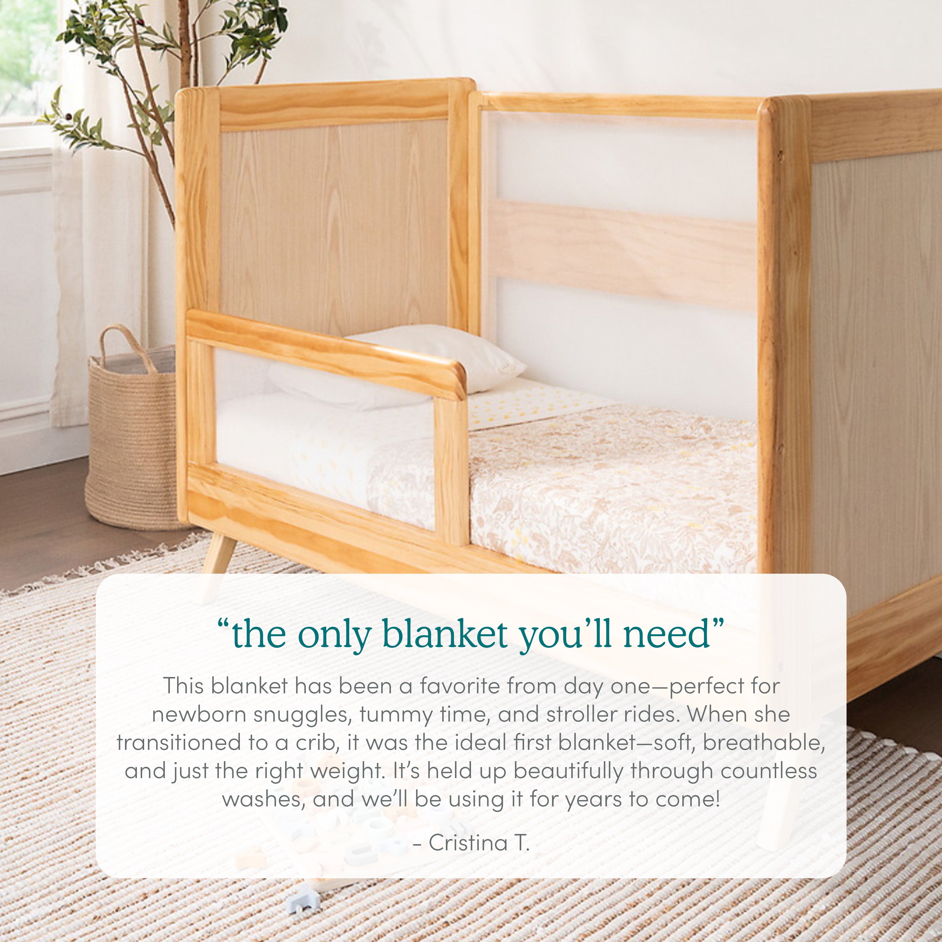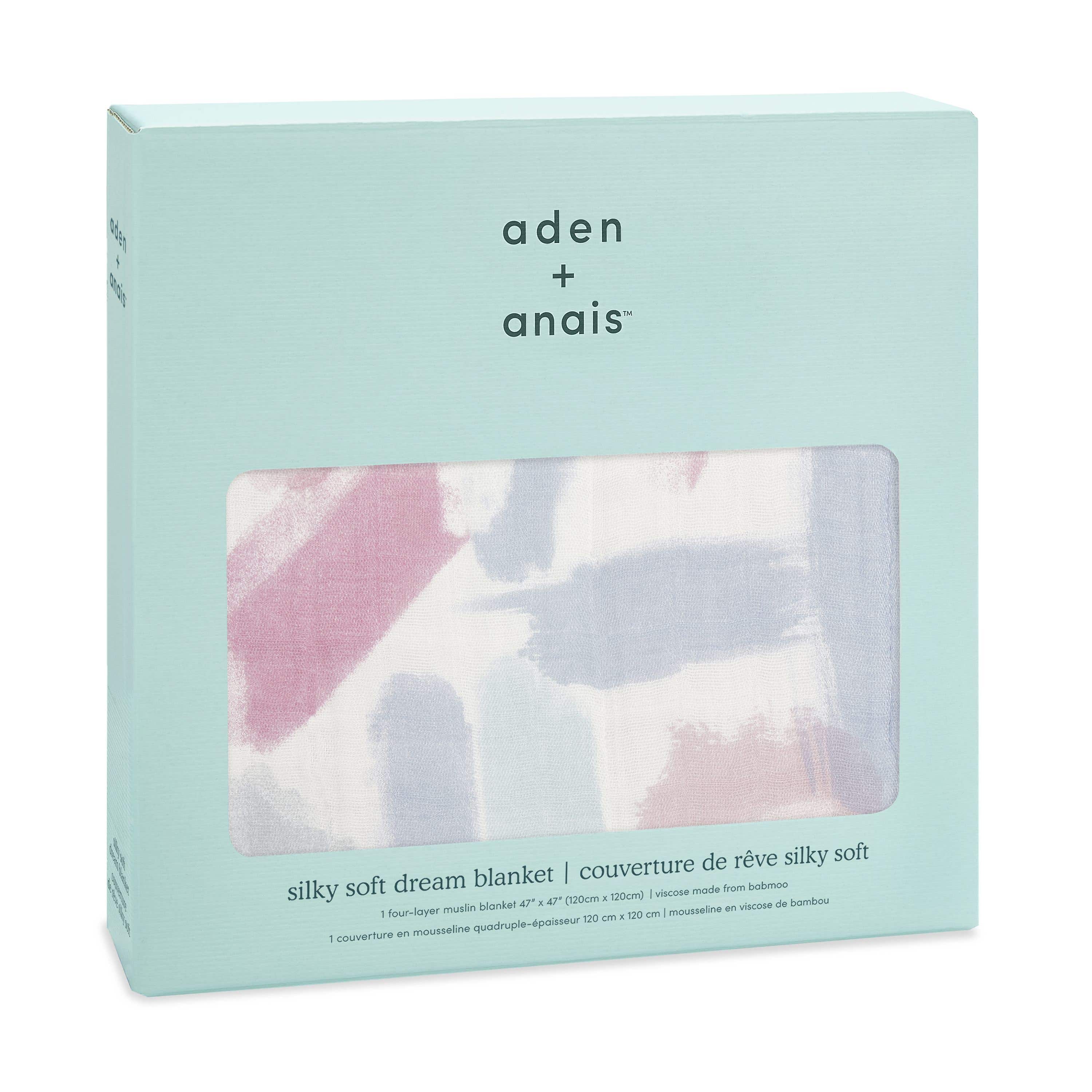 The aden + anais boutique silky soft muslin dream blanket features folded, lightweight bamboo-infused viscose fabric with pastel watercolor-like patterns in pink, blue, and white, offering a cozy yet cool touch perfect for nursery decor or a babys crib.