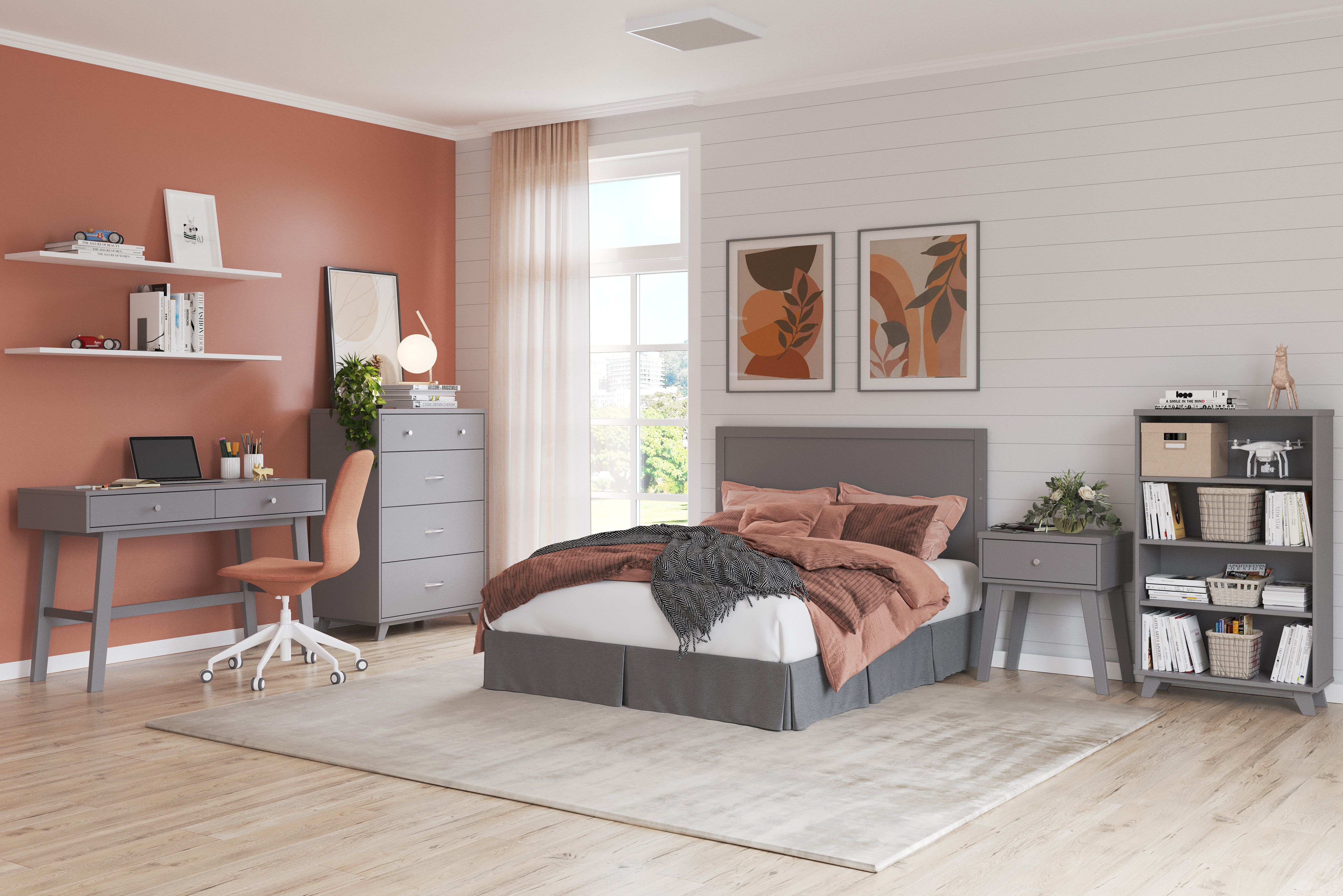 The Child Craft Soho 4-in-1 Flat Top Convertible Crib in Cool Gray with a white mattress sits against a muted pink wall. Abstract art hangs above, a plant basket is on the left, and wooden toys like a plane are scattered on the floor in front.