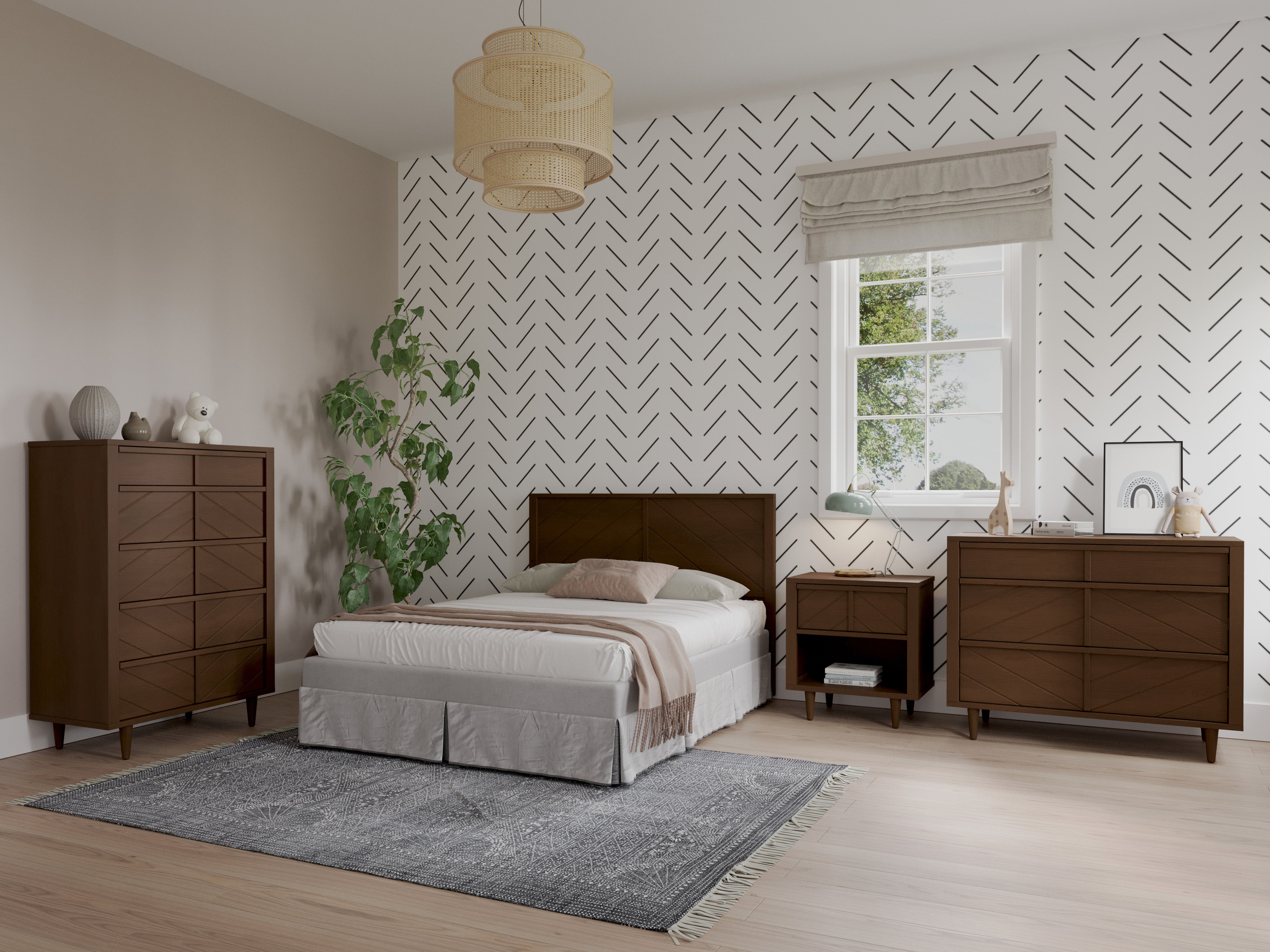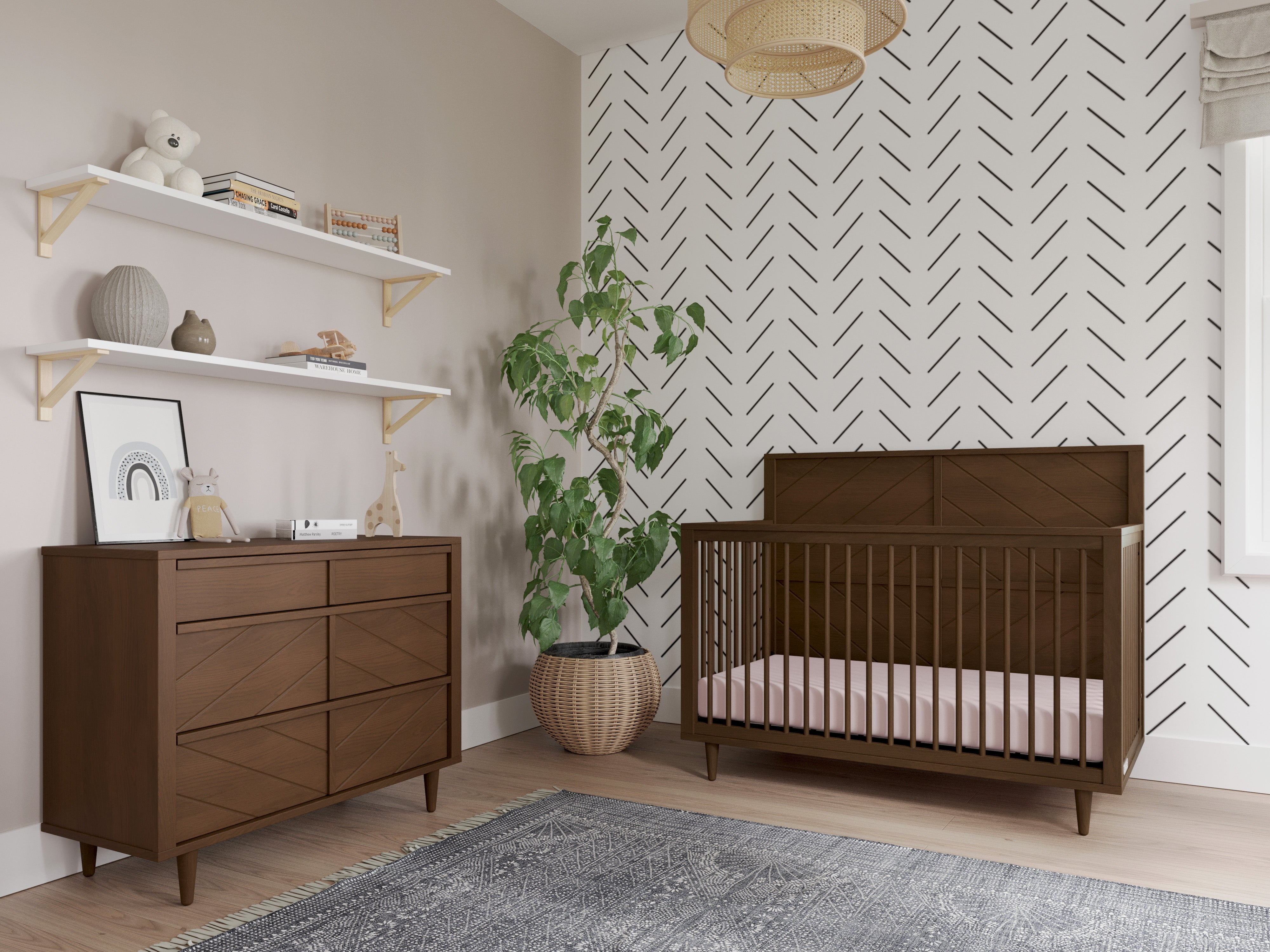 Modern nursery room with dark wood crib, dresser, Child Craft Surrey Hill 5 Drawer Chest in Toasted Chestnut, potted plant, patterned wallpaper, large window with shade, and gray rug on a light wood floor.