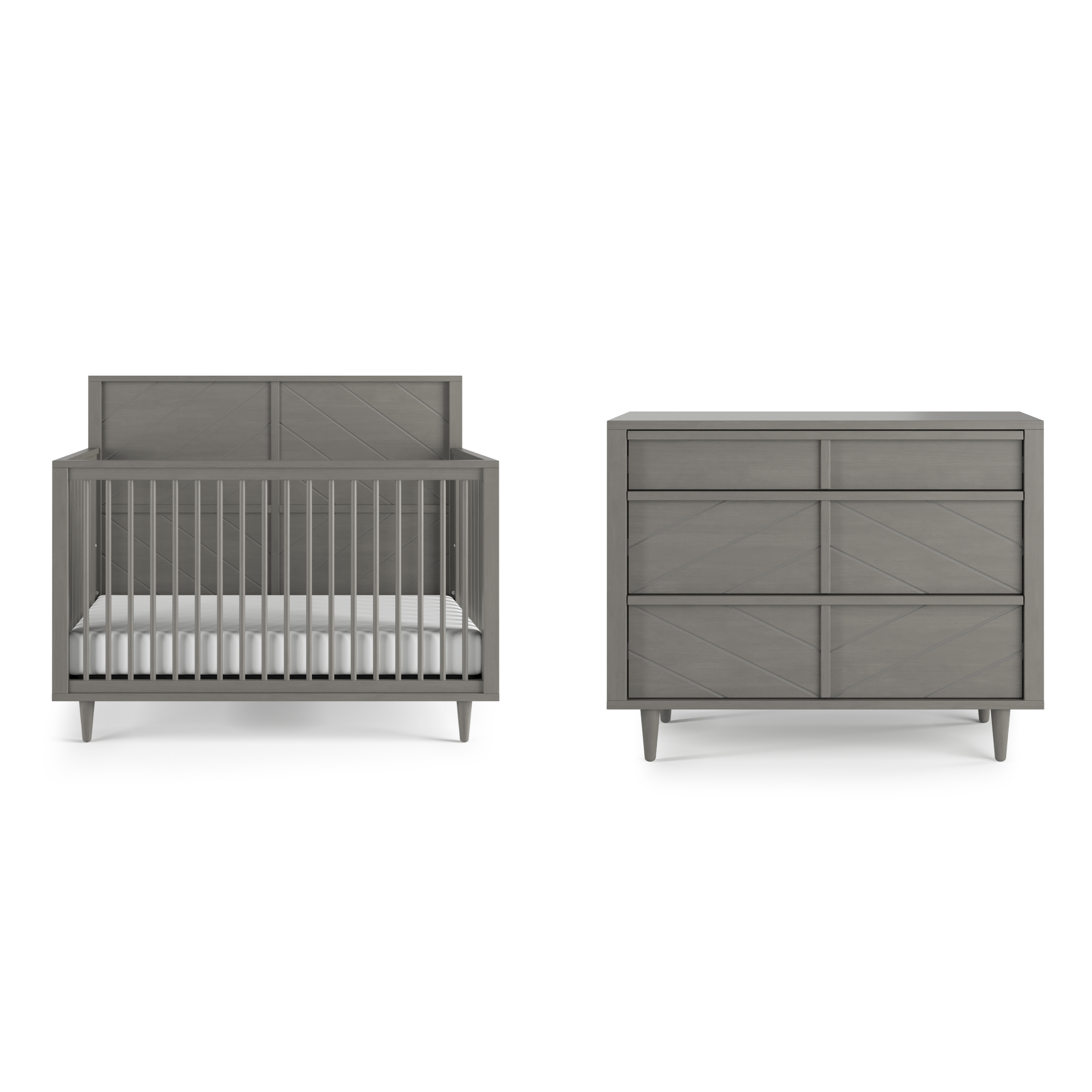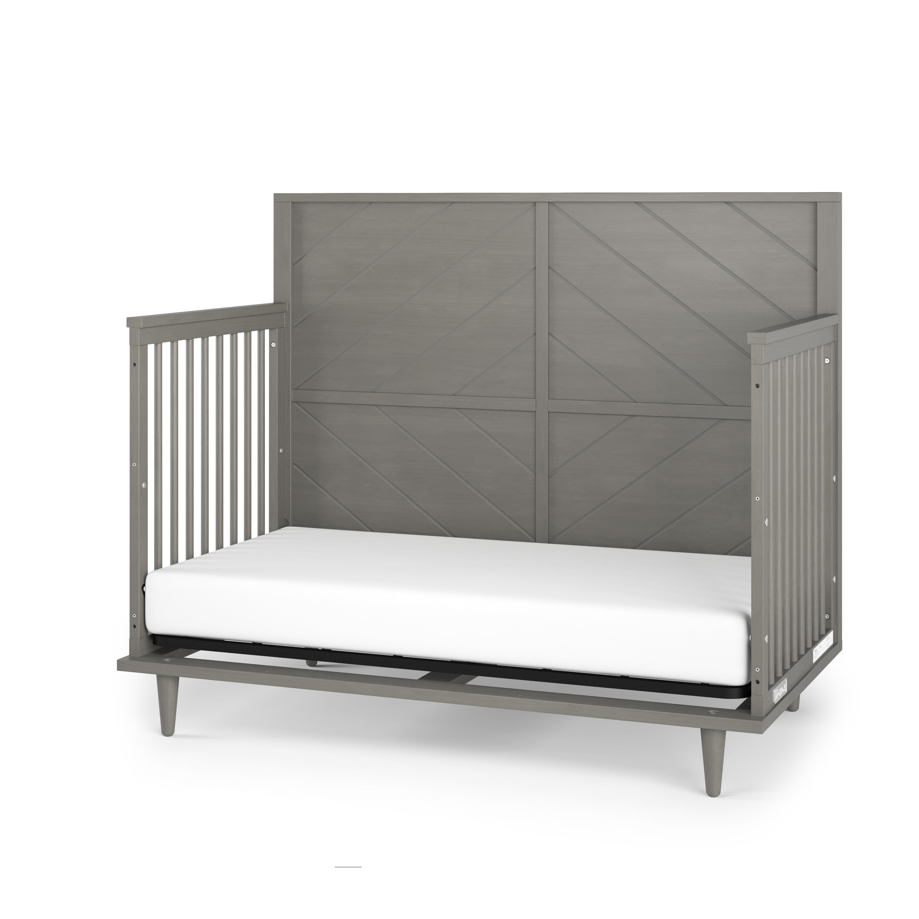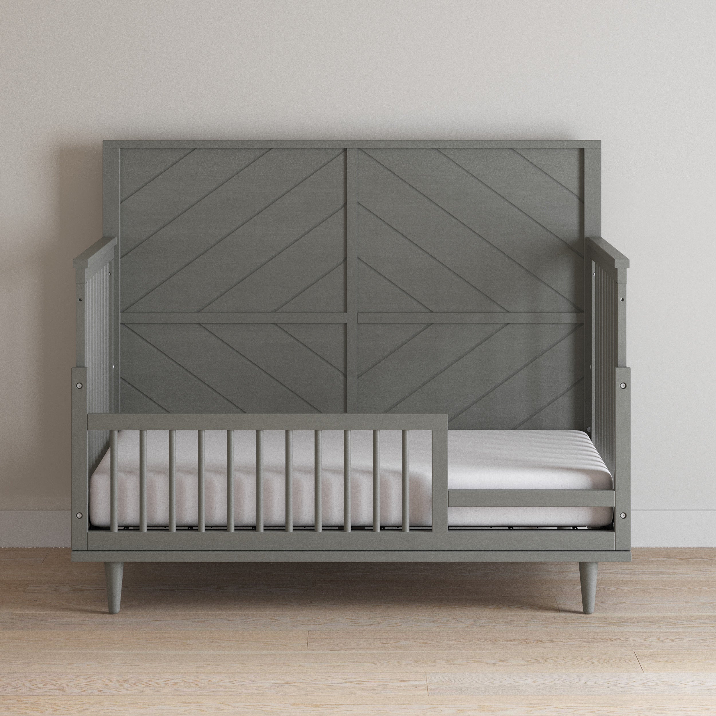 The Child Craft Surrey Hill 4-in-1 Convertible Crib in Lunar Gray, featuring a chevron-patterned headboard, stands against a green wall with part of a rug, a plant, and a framed picture also visible in the room.