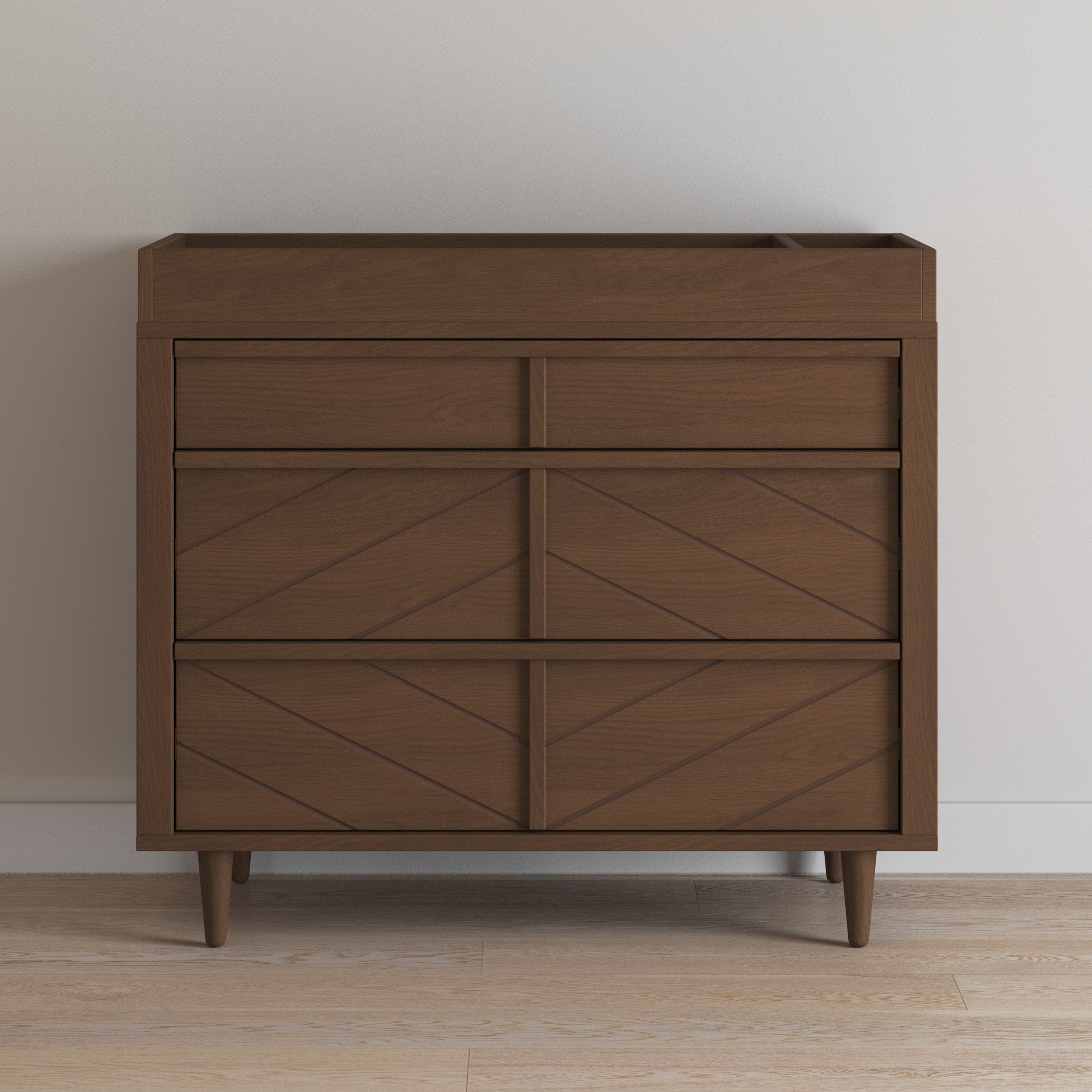 The Child Craft Surrey Hill 3 Drawer Dresser in Toasted Chestnut stands before a white wall with black lines, topped with a framed rainbow print, plush toy, wooden giraffe, camera, and a decorative box.