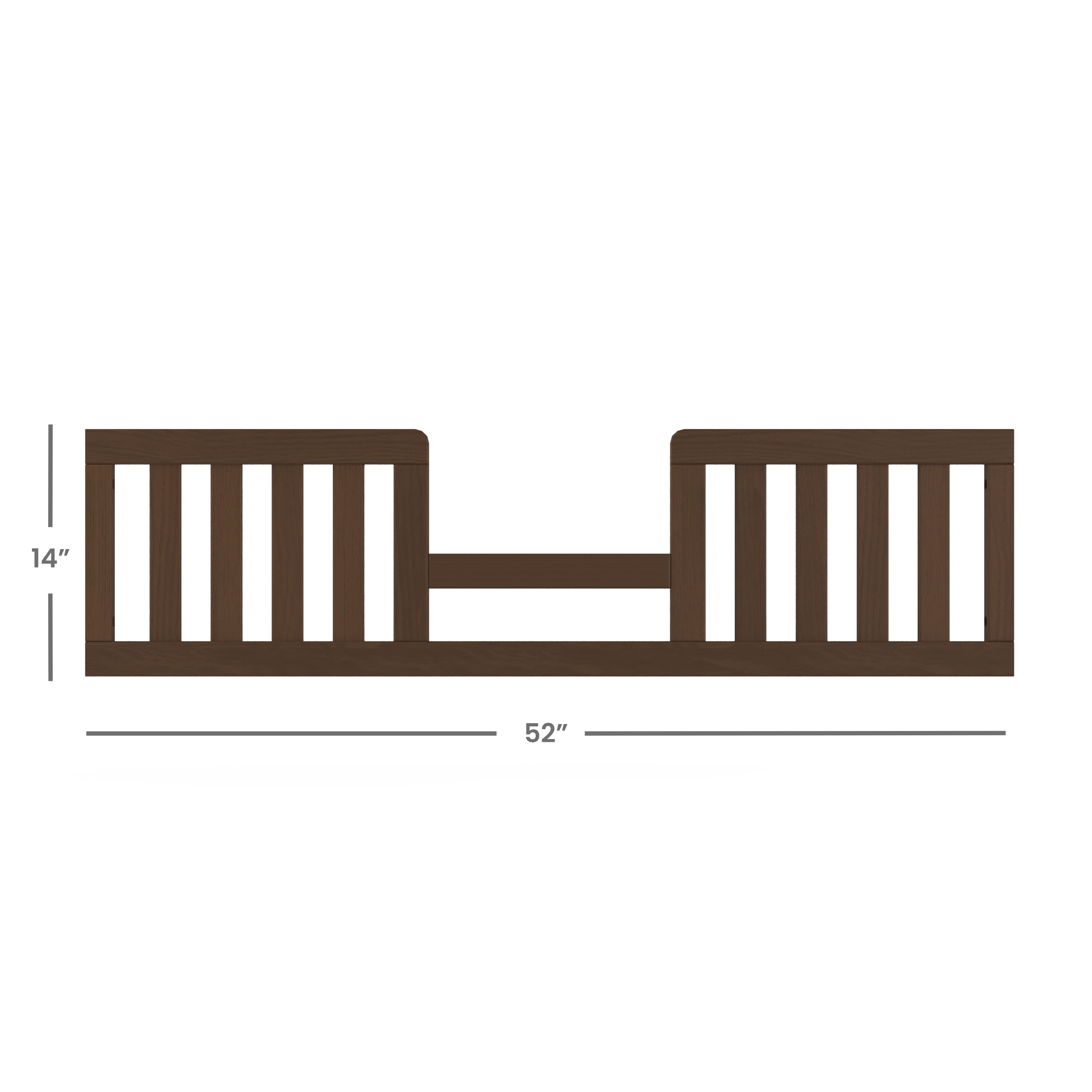 The Child Craft Toddler Guard Rail in Toasted Chestnut features vertical slats and an open center for safety. Designed for crib conversion, it attaches to your bed and has baby-safe finishes. Shown against a plain white background.
